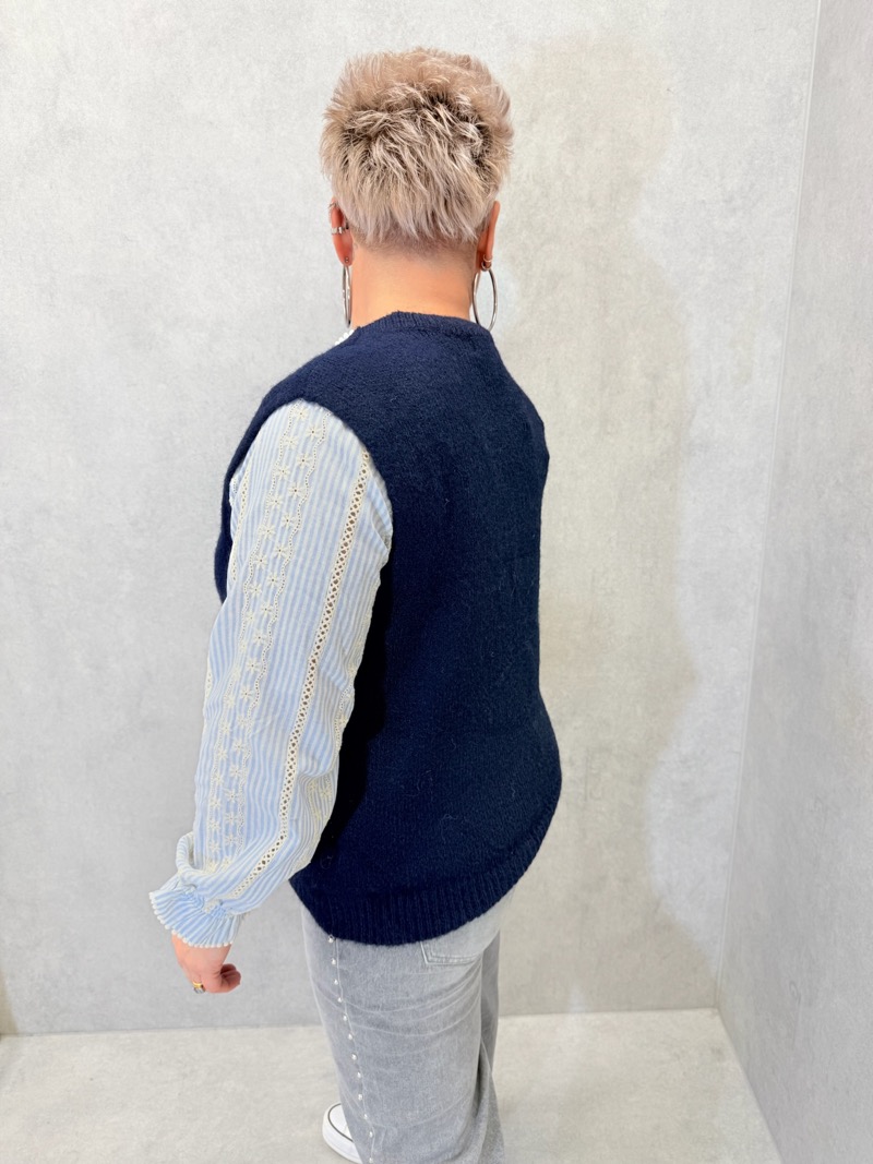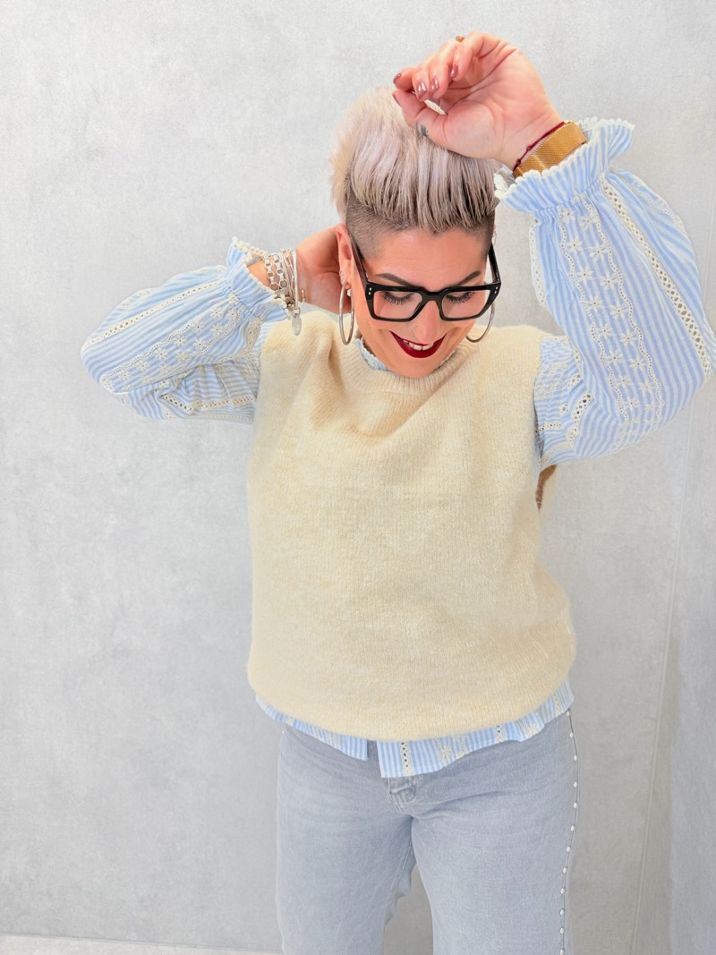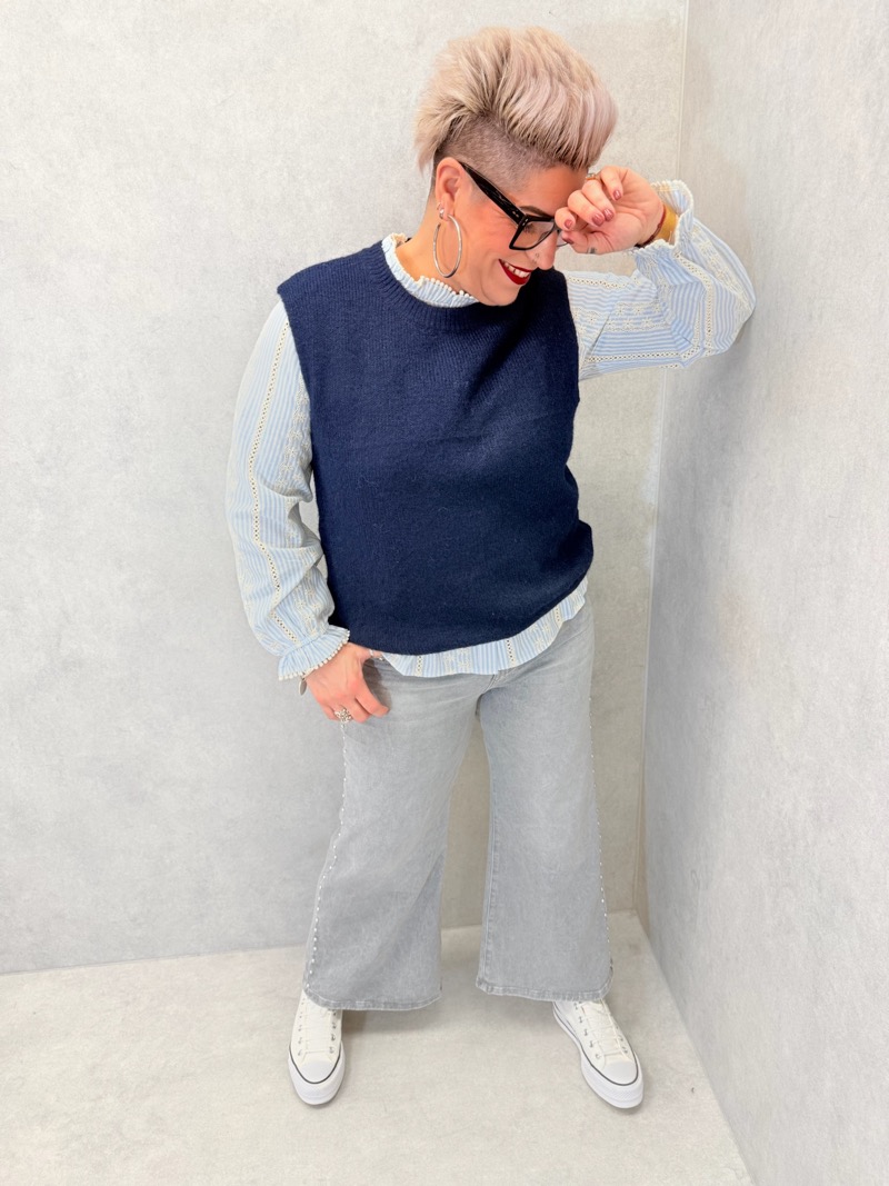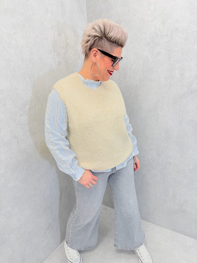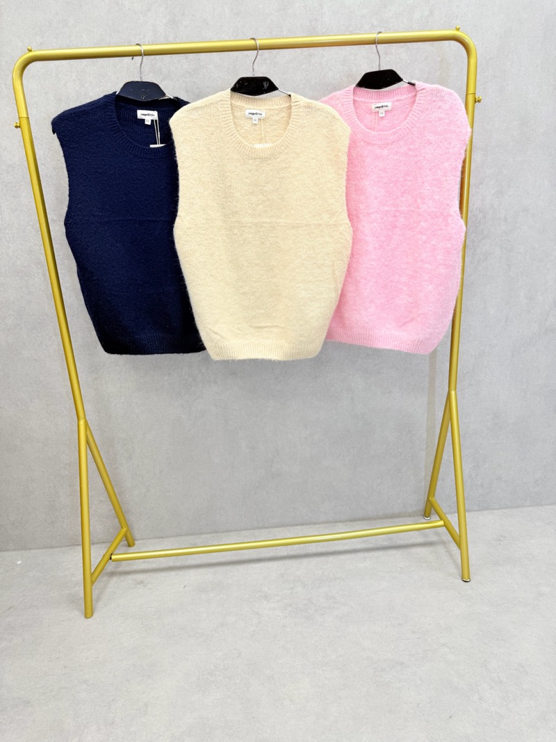 Ce pull sans manches se porte parfaitement sur une chemise, un t-shirt manches longues ou un col roulé pour un look tendance et structuré. Associé à un jean, un pantalon droit ou une jupe, il apporte une touche moderne et cosy à la tenue. Pour un style plus chic, il peut être porté sur une chemise blanche avec un pantalon tailleur. Une pièce idéale pour proposer à vos clientes un look confortable, féminin et facile à adopter.