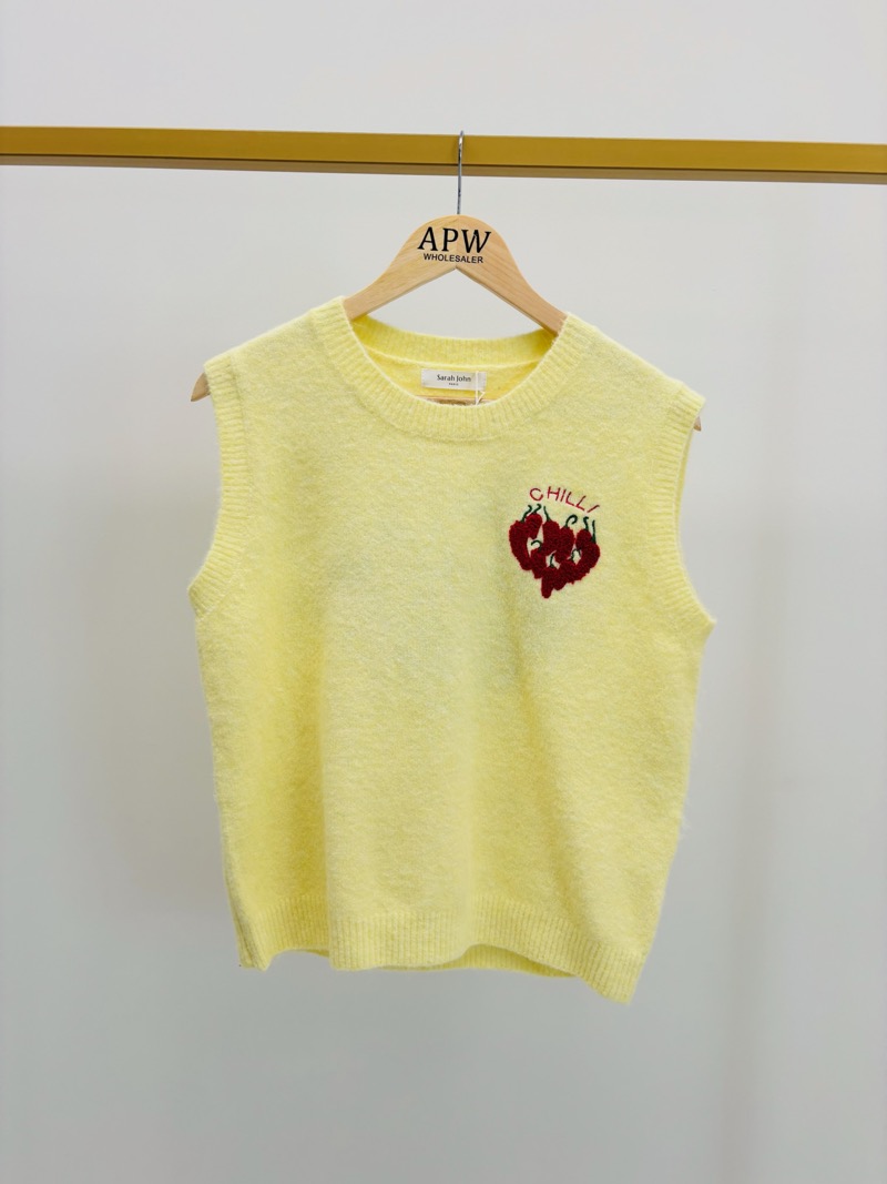 Ce pull sans manches en maille douce séduit par son esprit fun et solaire. Sa teinte jaune pastel lumineuse apporte fraîcheur et modernité, tandis que son motif “Chilli” brodé style effet bouclette crée une signature forte et différenciante.