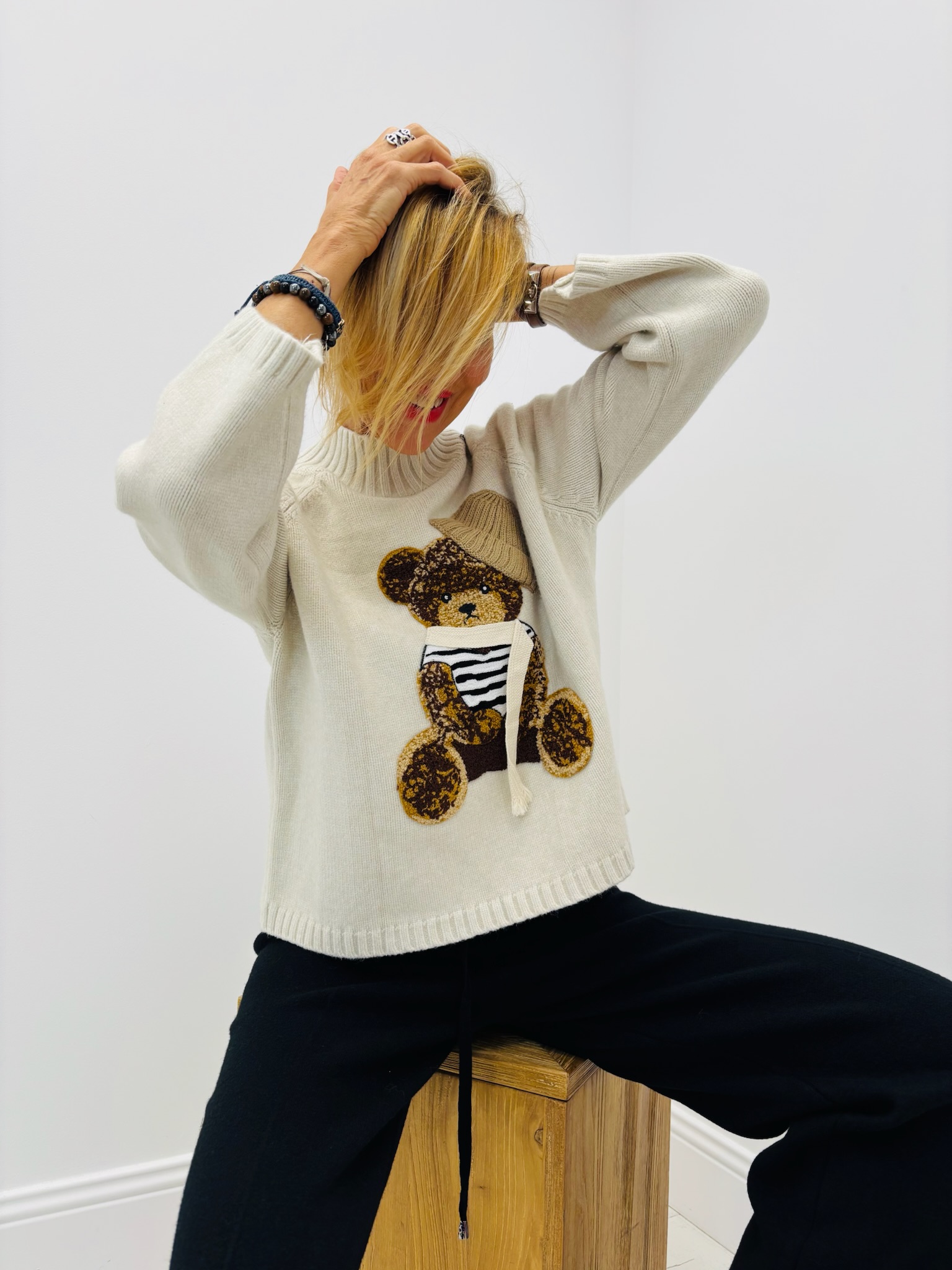 Un modèle craquant et plein de charme 🧸 signé VALENTYNE. Ce pull en maille douce de viscose séduit par son adorable motif ours en relief, habillé d’un bonnet tricoté et d’une écharpe rayée. Un look original et chaleureux, parfait pour la saison !