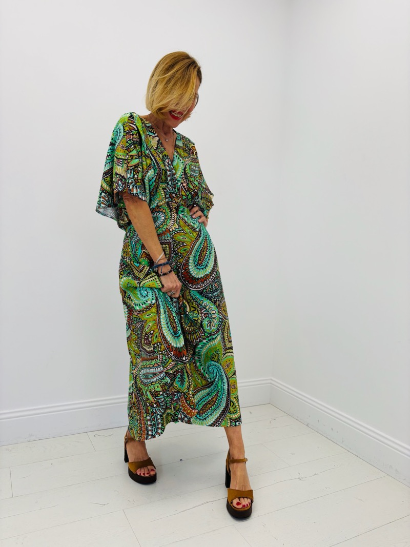 Une robe forte et lumineuse qui incarne parfaitement l’esprit bohème chic. Avec son imprimé cachemire riche en couleurs et ses motifs travaillés, elle attire immédiatement le regard et apporte une vraie valeur mode à ta sélection.