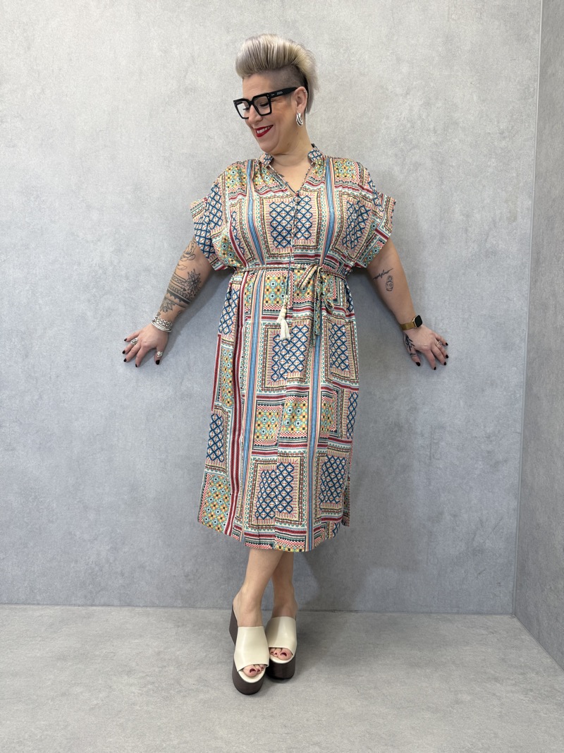 Une robe fluide au charme bohème chic, pensée pour sublimer les silhouettes du 44 au 58 avec élégance et confort. Son imprimé graphique aux inspirations ethniques apporte caractère et modernité, tout en restant facile à vendre grâce à ses couleurs harmonieuses.
