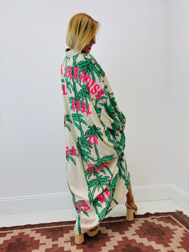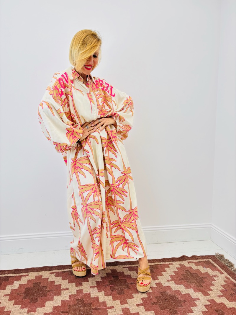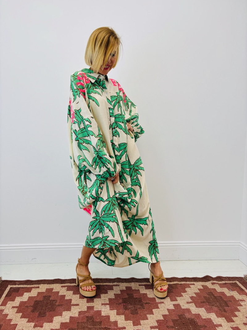 Confectionnée dans un mélange fluide de viscose et de lin, cette robe chemise longue séduit par son tombé léger et sa sensation aérienne sur la peau. Son imprimé palmier oversize apporte une véritable signature visuelle, disponible en deux déclinaisons lumineuses : fond crème avec palmiers verts profonds ou version crème aux nuances rose corail éclatantes.