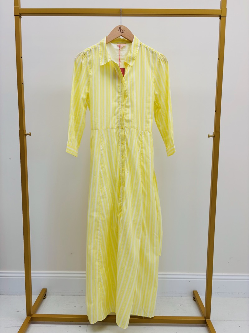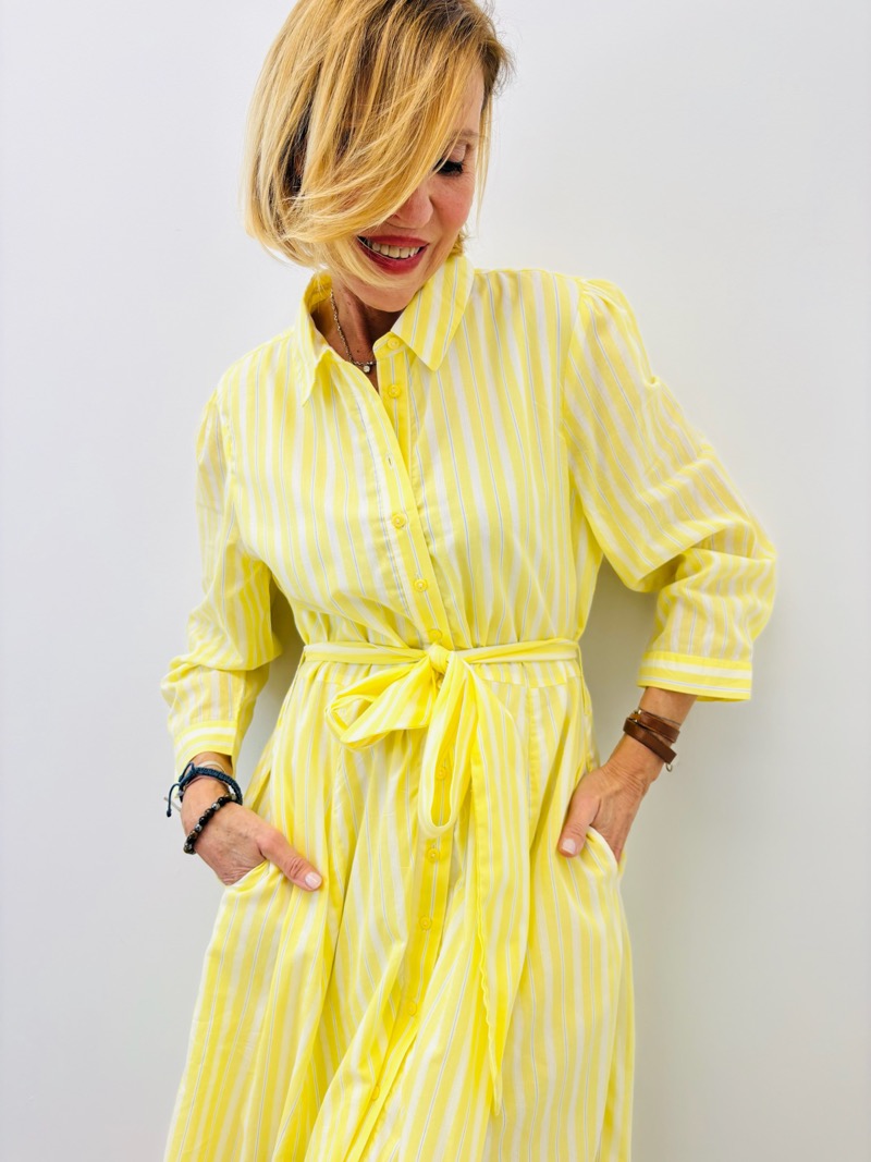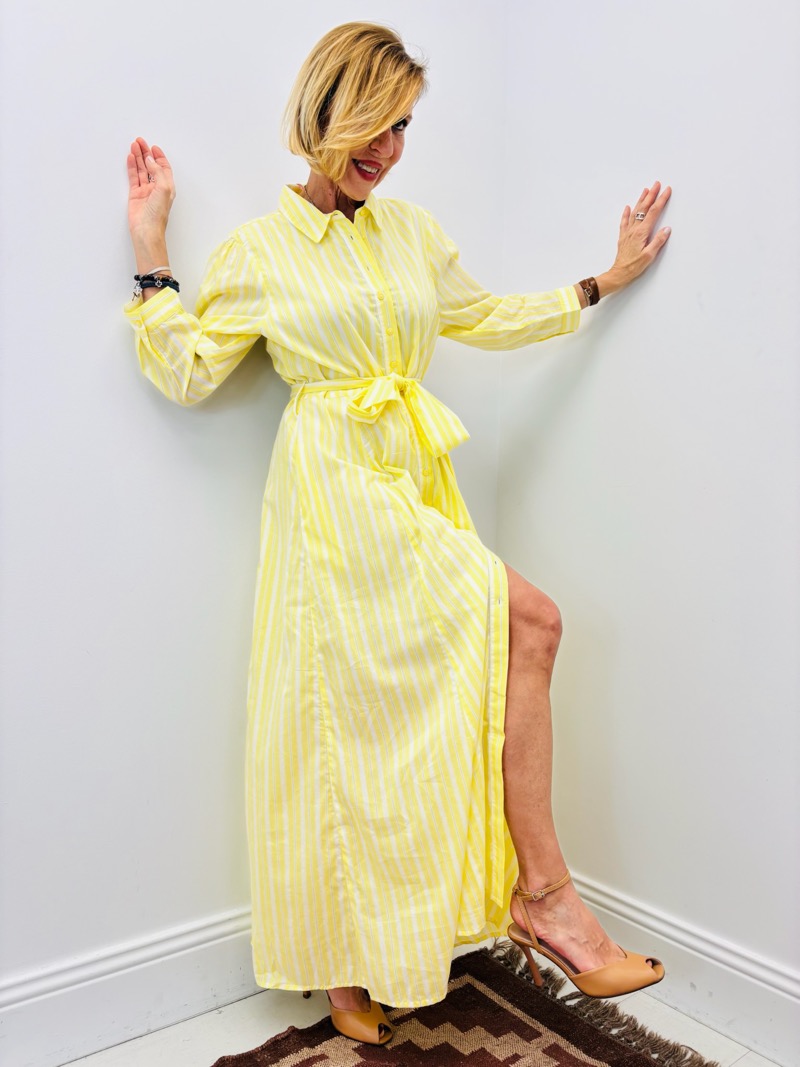 Cette robe chemise longue incarne parfaitement l’esprit lumineux et raffiné de la saison. Son imprimé rayé vertical dans un jaune éclatant apporte fraîcheur et dynamisme, tout en allongeant visuellement la silhouette.