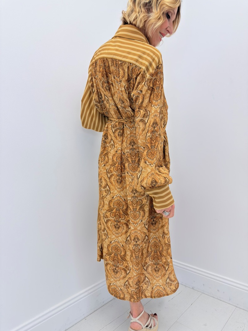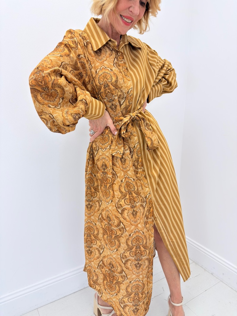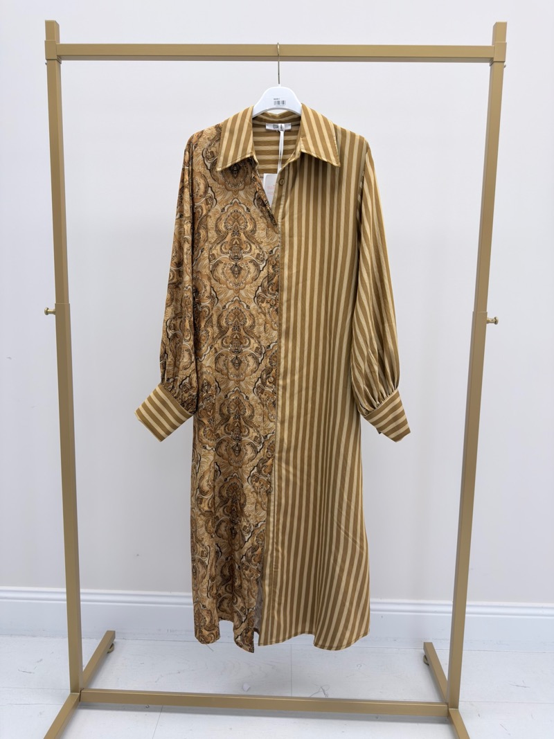 Cette robe chemise se distingue par son design patchwork original, mêlant un imprimé cachemire élégant et des rayures verticales modernes. Ce contraste de motifs crée un style unique qui apporte immédiatement du caractère à la silhouette.