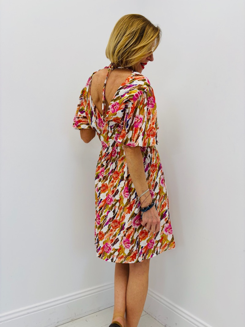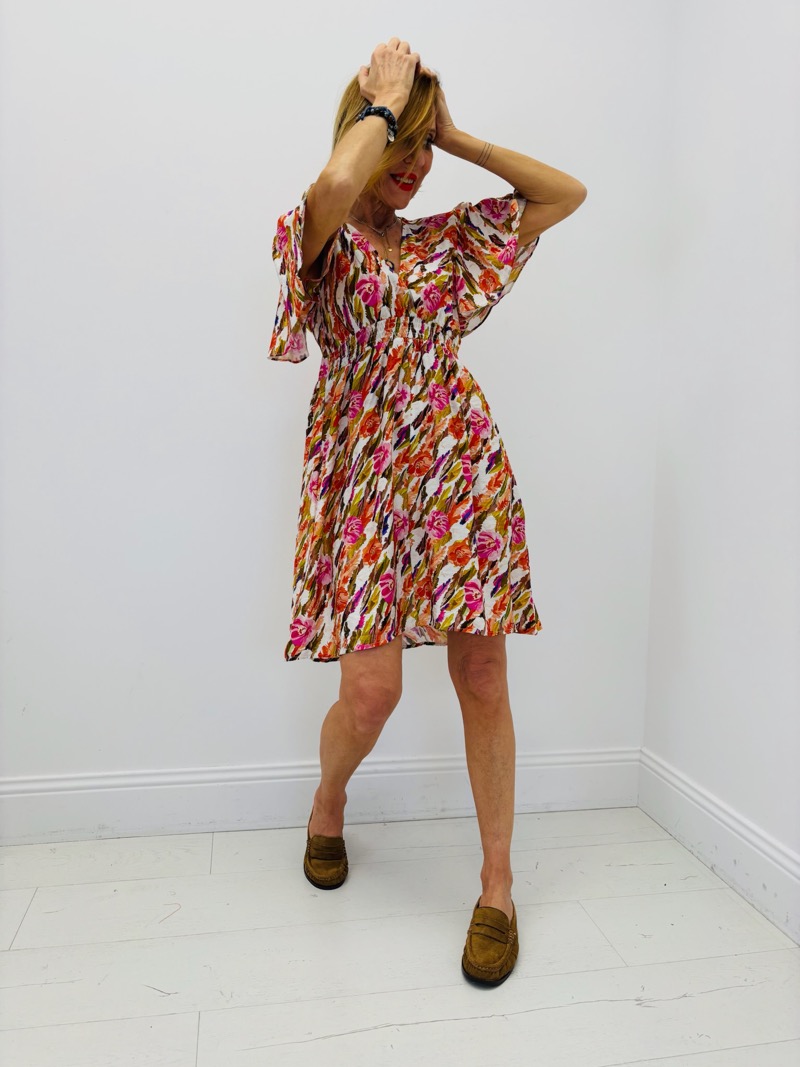 Cette robe courte incarne une féminité naturelle avec une touche bohème moderne. Son imprimé floral multicolore, mêlant des tons chauds et lumineux, apporte fraîcheur et dynamisme à la silhouette, idéale pour la saison estivale.