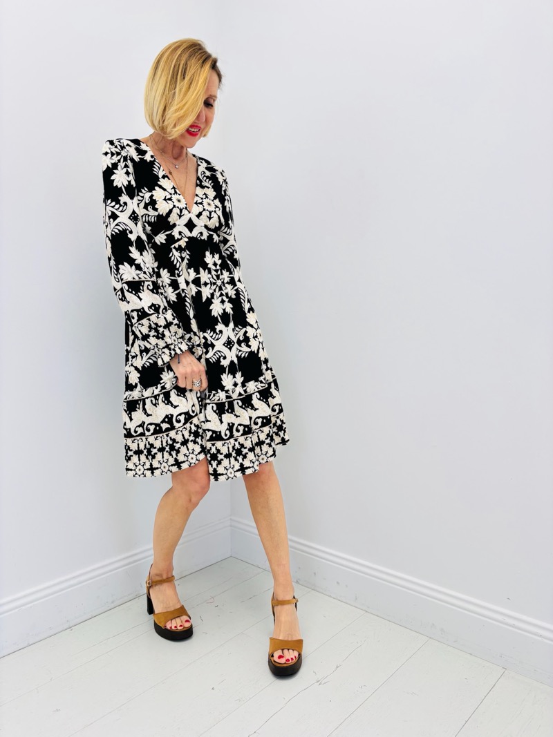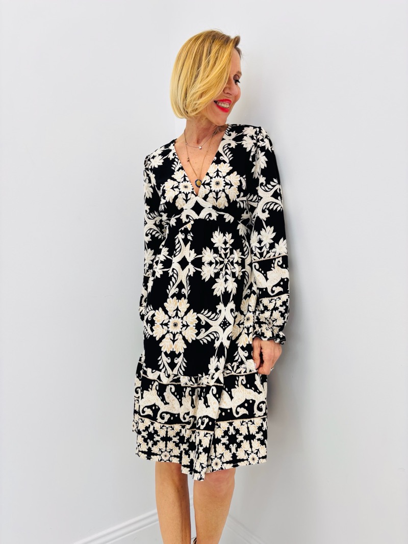 Avec ses motifs inspirés et son jeu de contrastes noir et écru, cette robe se distingue par son style chic et polyvalent, idéale pour une clientèle à la recherche de pièces élégantes et faciles à porter.