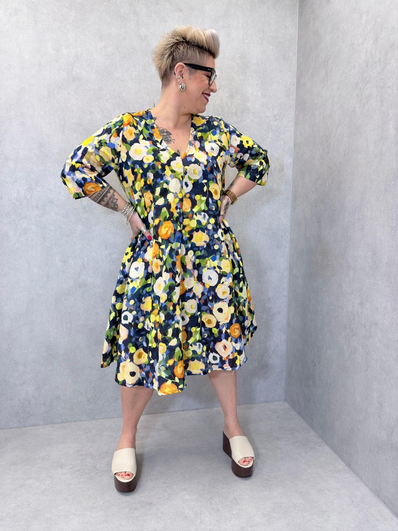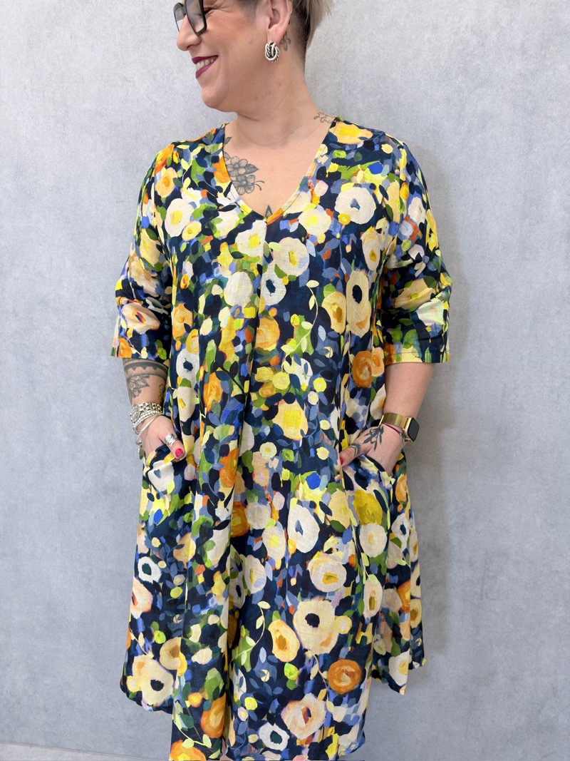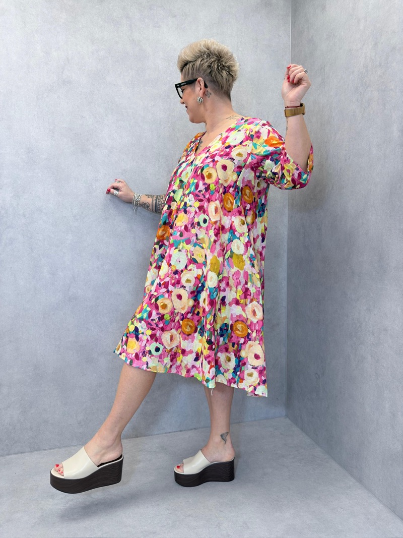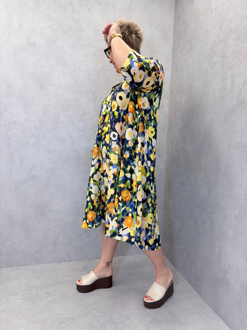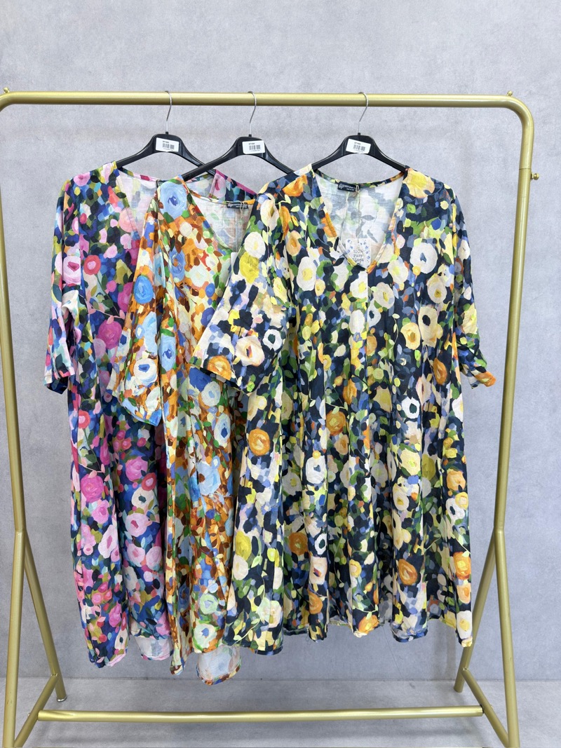 Déclinée en plusieurs variations de couleurs (tons bleus, verts, orangés ou rosés), cette robe s’adapte à toutes les envies et permet de varier les styles facilement. C’est une pièce forte, idéale pour dynamiser une collection avec une touche artistique et estivale.