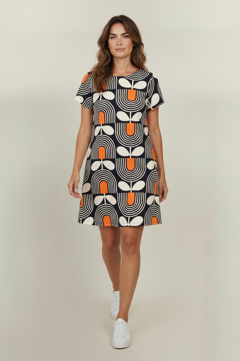 Cette robe à motif floral graphique séduit par son design audacieux et résolument moderne, inspiré des codes rétro revisités. Son imprimé contrasté mêlant formes florales stylisées et lignes graphiques crée un visuel fort, idéal pour dynamiser une collection estivale ou mi-saison.