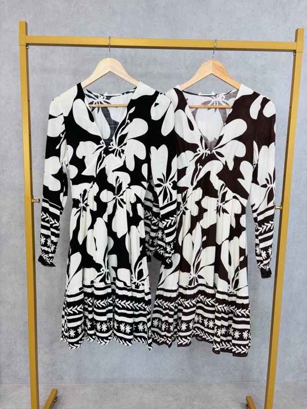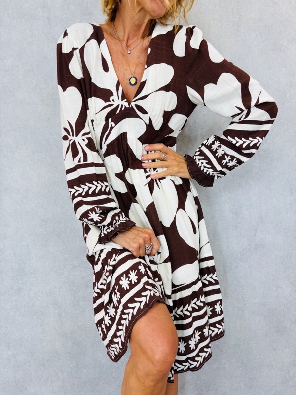 Élégante et fluide, cette robe en viscose séduit par son grand imprimé floral contrasté qui lui donne du caractère. Sa coupe évasée met en valeur la silhouette, tandis que le décolleté en V et la taille légèrement froncée ajoutent une touche féminine.