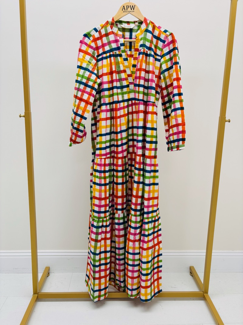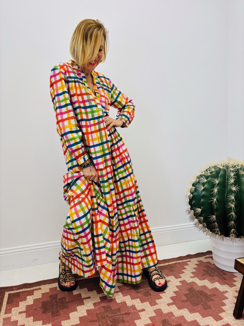 La robe longue carreaux multicolores est une pièce forte et joyeuse, idéale pour dynamiser une collection printemps-été avec un esprit graphique assumé. Son motif à carreaux aux teintes vibrantes — rose, orange, jaune, vert et bleu — apporte fraîcheur et modernité tout en restant facile à associer.