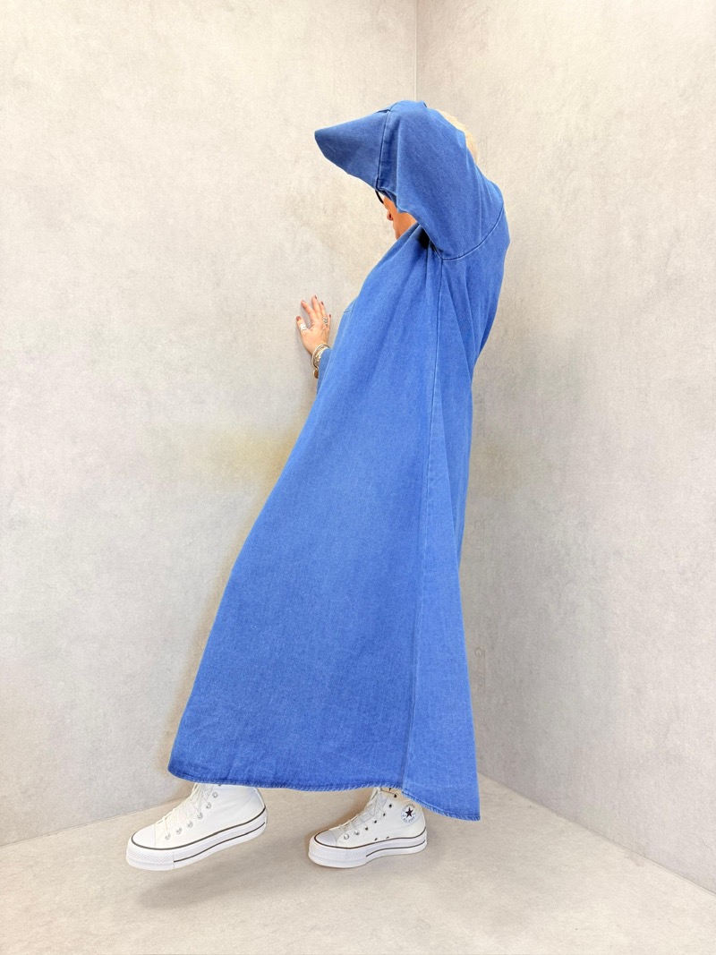 La longueur midi à longue est idéale pour une clientèle grande taille : elle élance la silhouette et s’adapte facilement à différents styles. La sobriété du denim uni permet de jouer avec les accessoires, tout en restant une pièce forte à elle seule. C’est une robe très rassurante en boutique, facile à conseiller, qui répond parfaitement aux attentes des clientes recherchant confort, style et polyvalence.