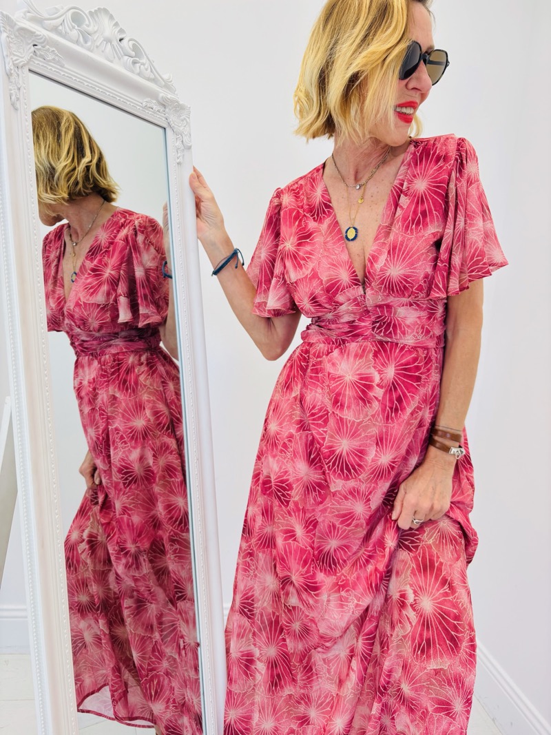 Cette robe longue séduit immédiatement par son imprimé floral lumineux dans des tons fuchsia et rose, apportant une touche vibrante et féminine à la silhouette. Son motif délicat, façon éclats floraux, crée un effet visuel raffiné et moderne, idéal pour la saison.