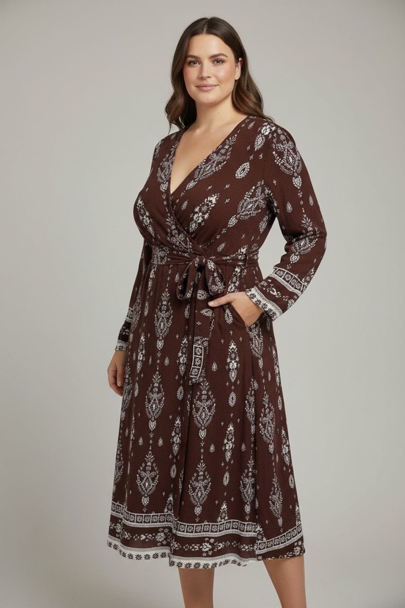 Élégante et confortable, cette robe longue est idéale pour sublimer les silhouettes généreuses. Sa coupe fluide apporte légèreté et aisance, tandis que le décolleté en V croisé met en valeur le buste avec féminité. La ceinture ajustable souligne la taille pour une silhouette harmonieuse. Son imprimé bohème et ses détails raffinés en font une pièce parfaite aussi bien pour le quotidien que pour une occasion spéciale.