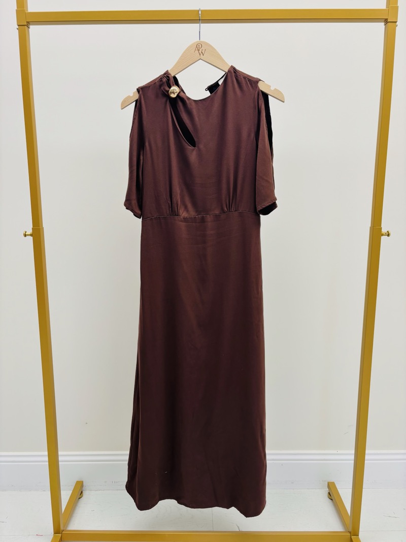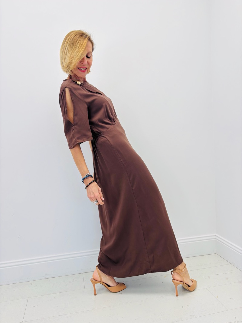 Portée avec des sandales à talons ou des mules élégantes, cette robe crée une silhouette sophistiquée et féminine. Elle peut également être associée à des accessoires dorés et une pochette minimaliste pour un look plus habillé. Sa coupe fluide et son tissu légèrement satiné en font une pièce idéale pour les occasions spéciales comme pour une tenue chic du quotidien.
