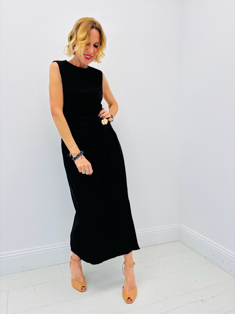 Le drapé latéral crée un effet structuré qui affine la taille et donne du mouvement à la robe. La fente discrète sur le devant apporte de la légèreté et permet une démarche fluide tout en restant chic.
