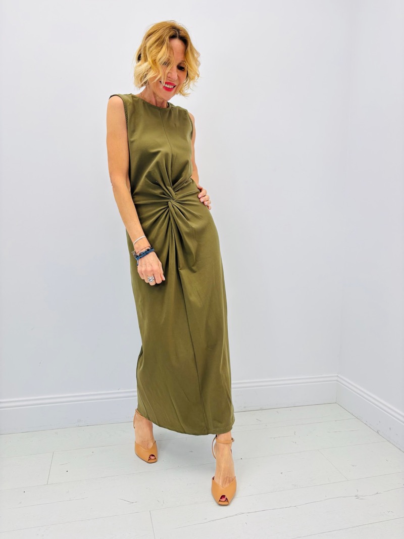 Le nœud central crée un effet de drapé naturel qui affine la taille et apporte une touche sophistiquée à la pièce. Sa longueur midi associée à une fente discrète sur le côté donne de l’allure tout en facilitant les mouvements.