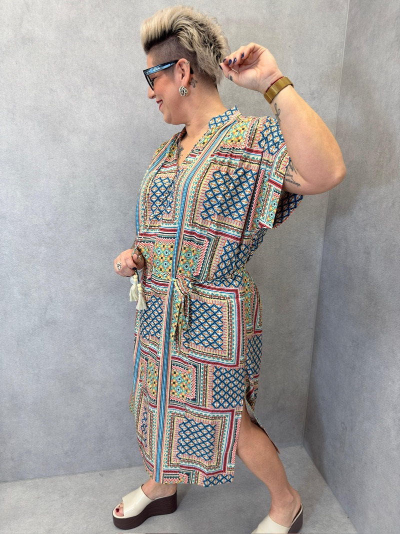 Cette robe midi grande taille séduit par son imprimé graphique d’inspiration ethnique, riche en détails et en couleurs harmonieuses. Le mélange de motifs géométriques et de teintes chaudes – bleu, terracotta, vert, beige et touches de jaune – crée une pièce visuellement forte, idéale pour dynamiser une collection grande taille avec une allure bohème chic très actuelle.