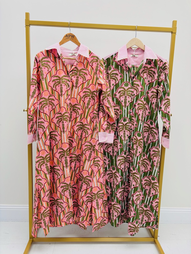 Disponible en versions rose et verte, cette robe est idéale pour des occasions décontractées tout en apportant une touche d’élégance.