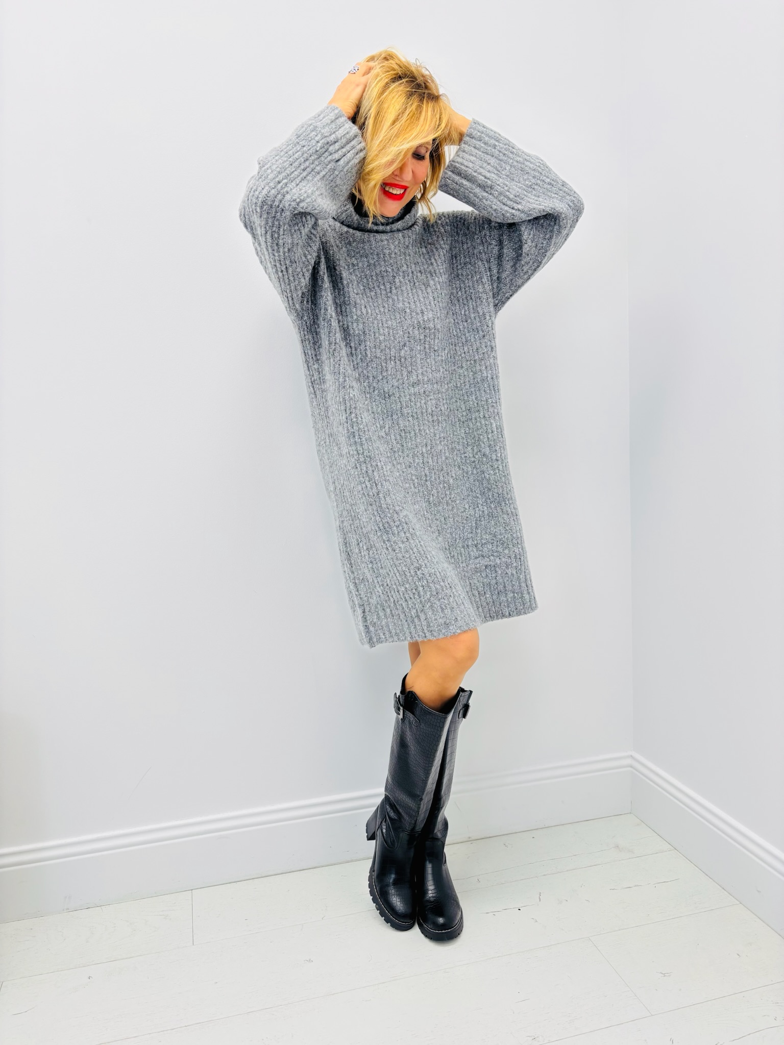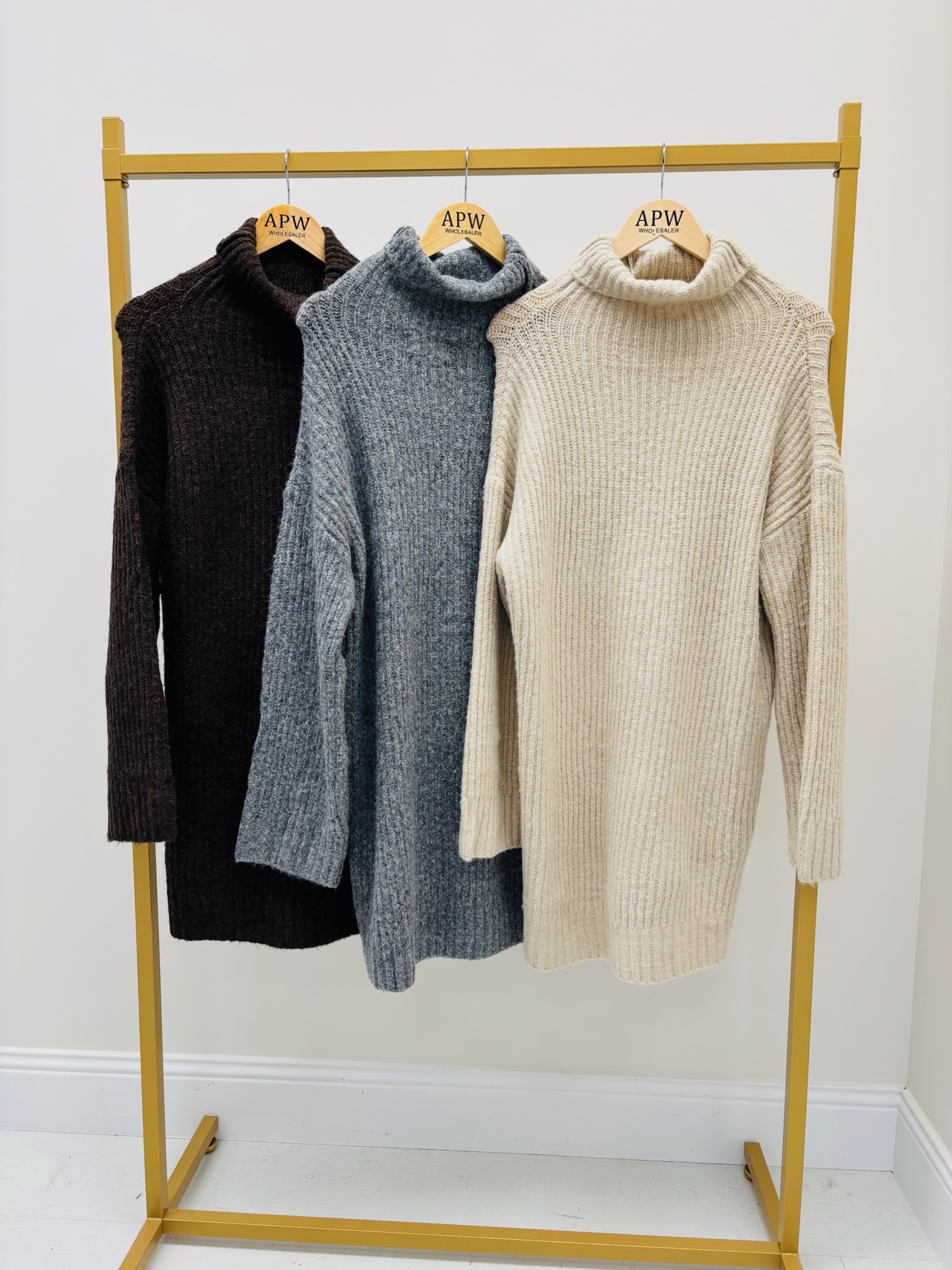 Robe pull en maille côtelée ultra douce, au col roulé enveloppant et à la coupe oversize.