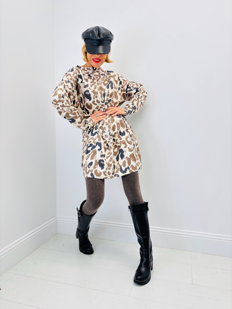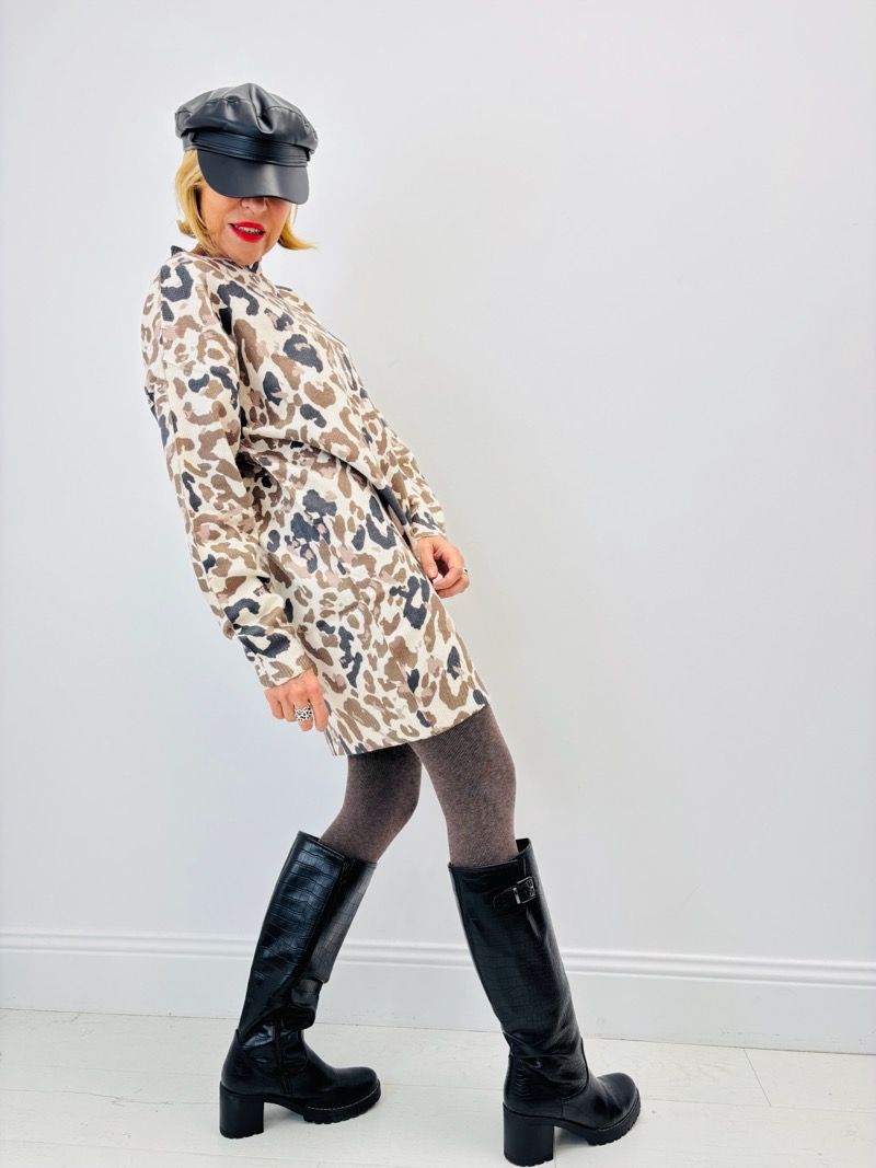 Sur les visuels, la robe léopard est associée à des collants côtelés bruns et des bottes noires hautes, pour un look hivernal dynamique et ultra moderne. La casquette en simili cuir ajoute une touche urbaine, tendance et affirmée.