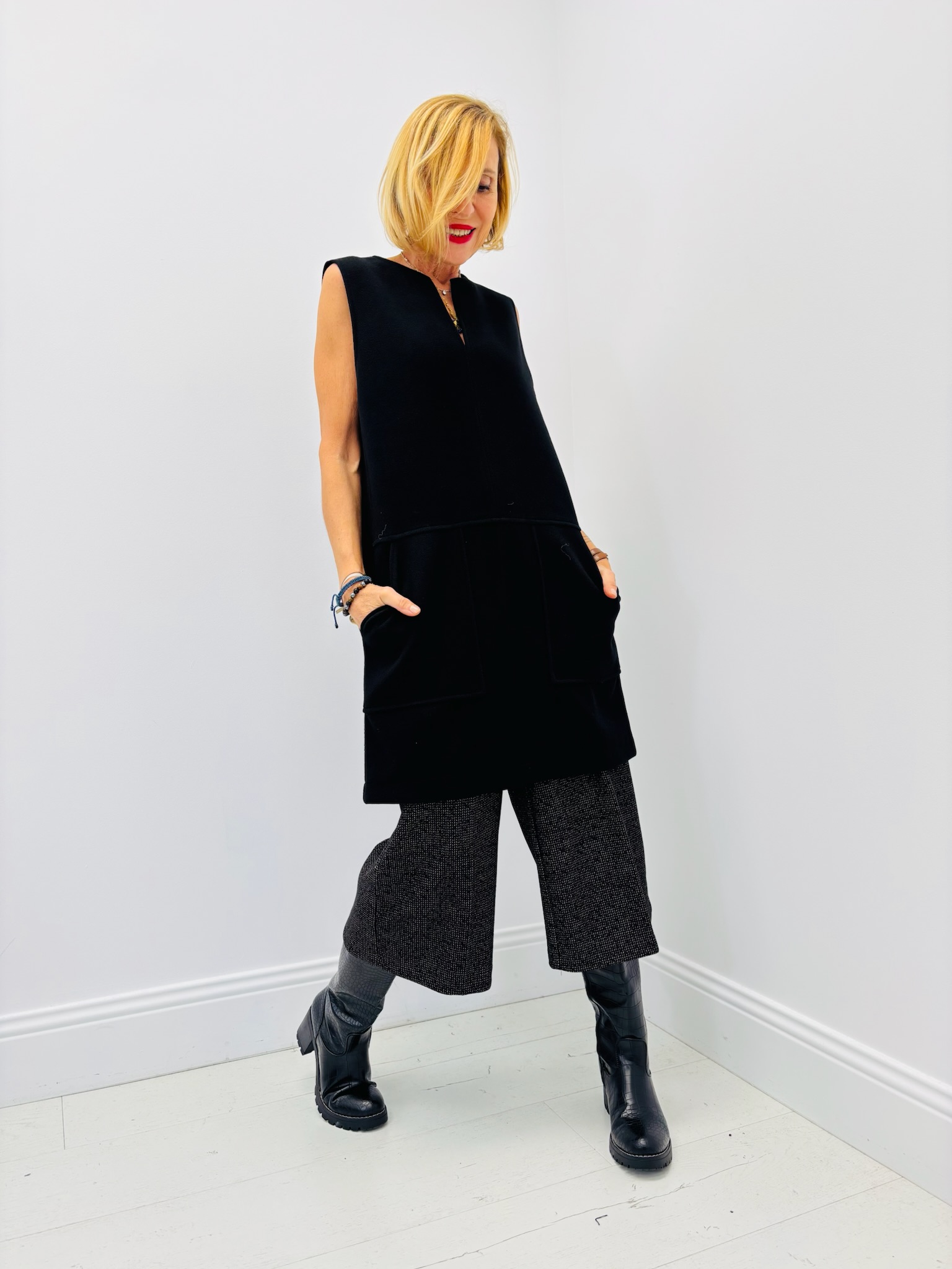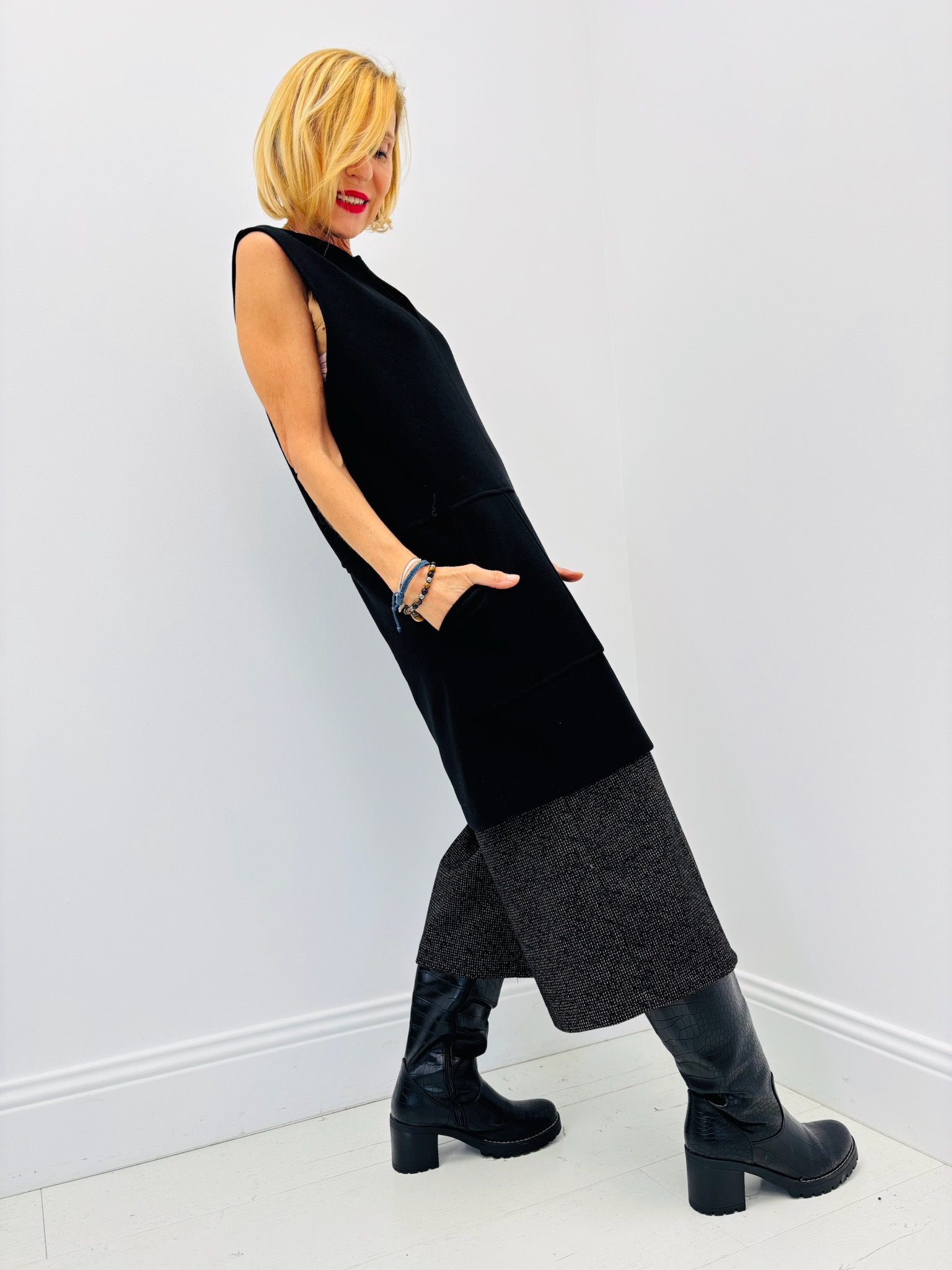 À porter seule avec des bottes hautes pour un look moderne, ou sur un col roulé fin pour un style plus structuré. Ajoutez un manteau long ou une veste courte pour un effet city chic.