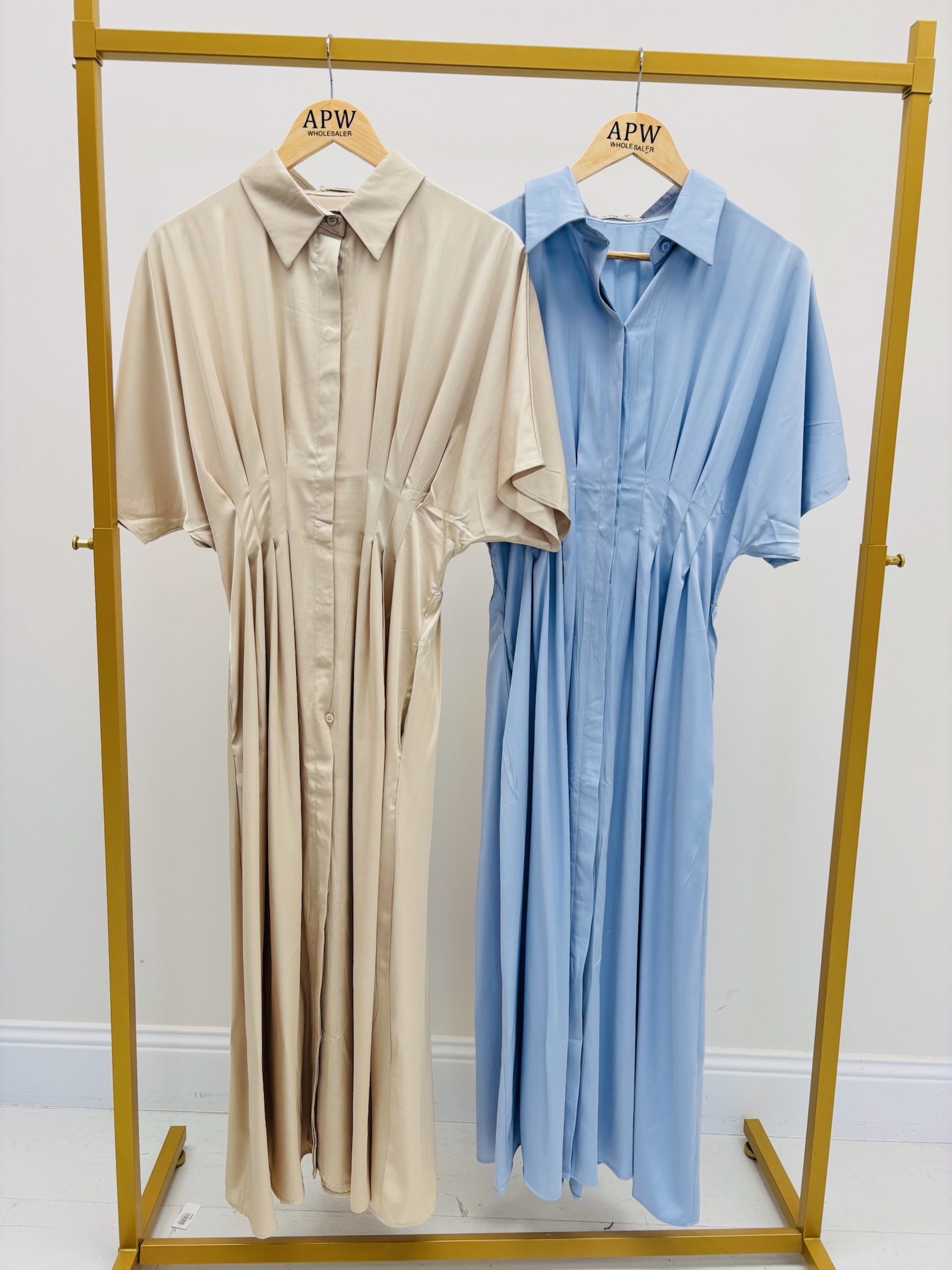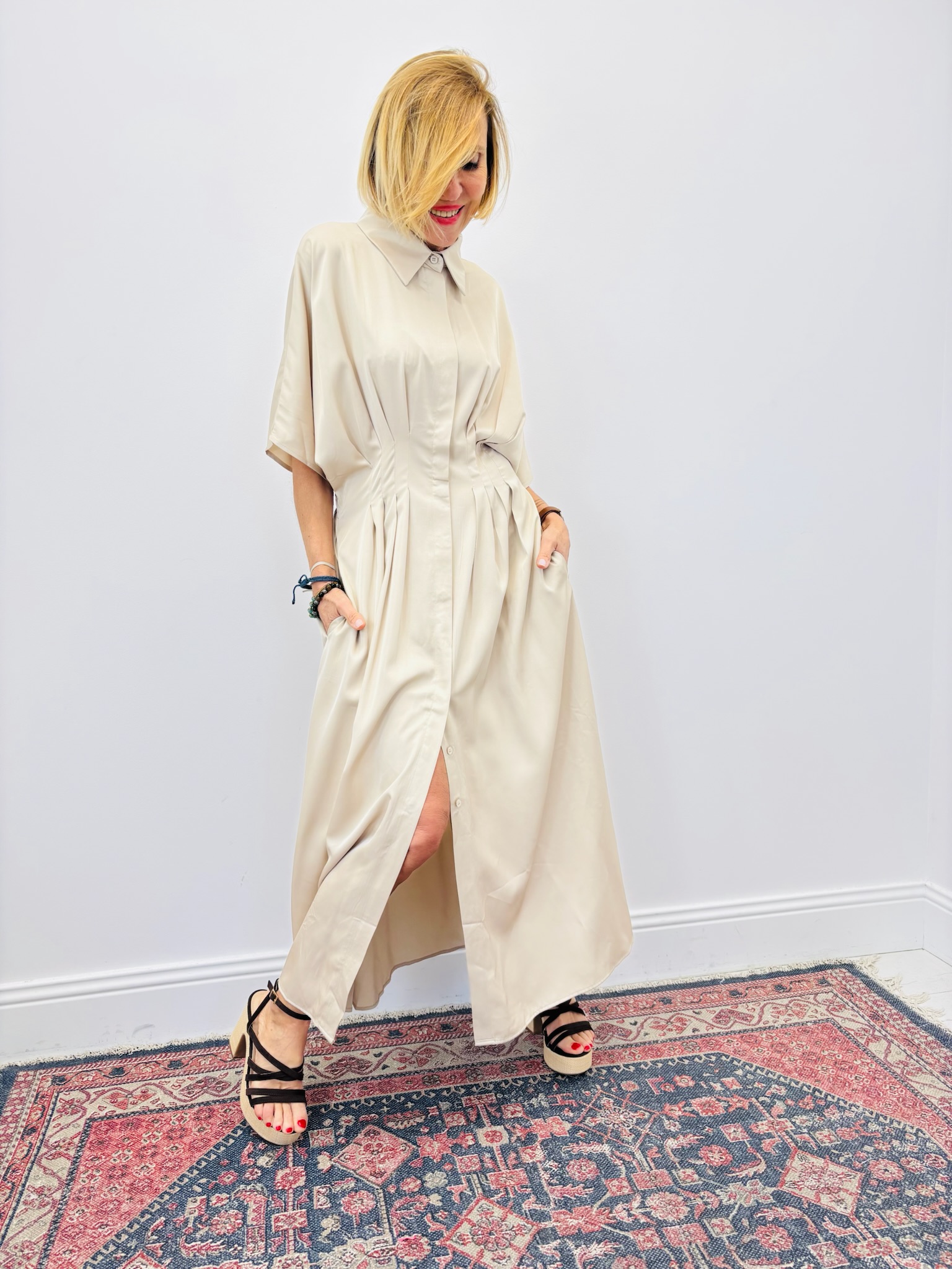 Sa longueur midi à longue allonge la silhouette, et sa coupe épurée permet de la porter aussi bien au quotidien que pour des occasions plus habillées. Les manches courtes et le col chemise apportent une note structurée et intemporelle, équilibrant parfaitement l’esprit fluide de la robe.