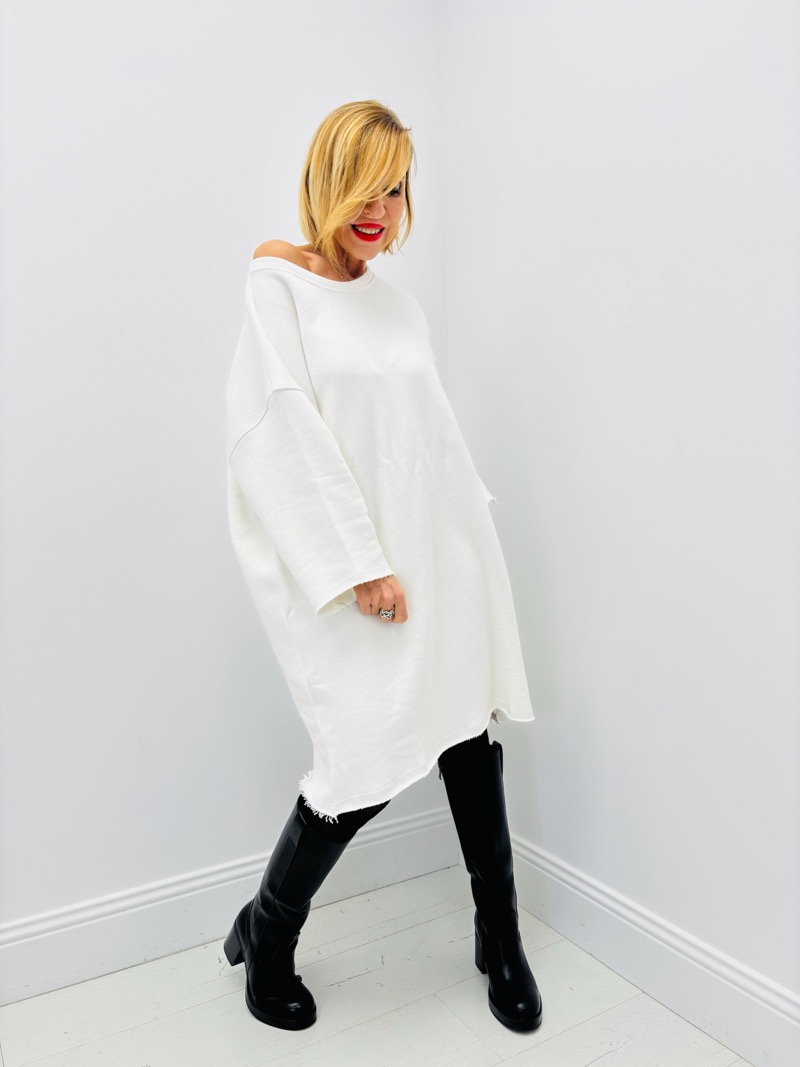 Portée en blanc, cette robe sweat révèle une élégance minimaliste irrésistible.