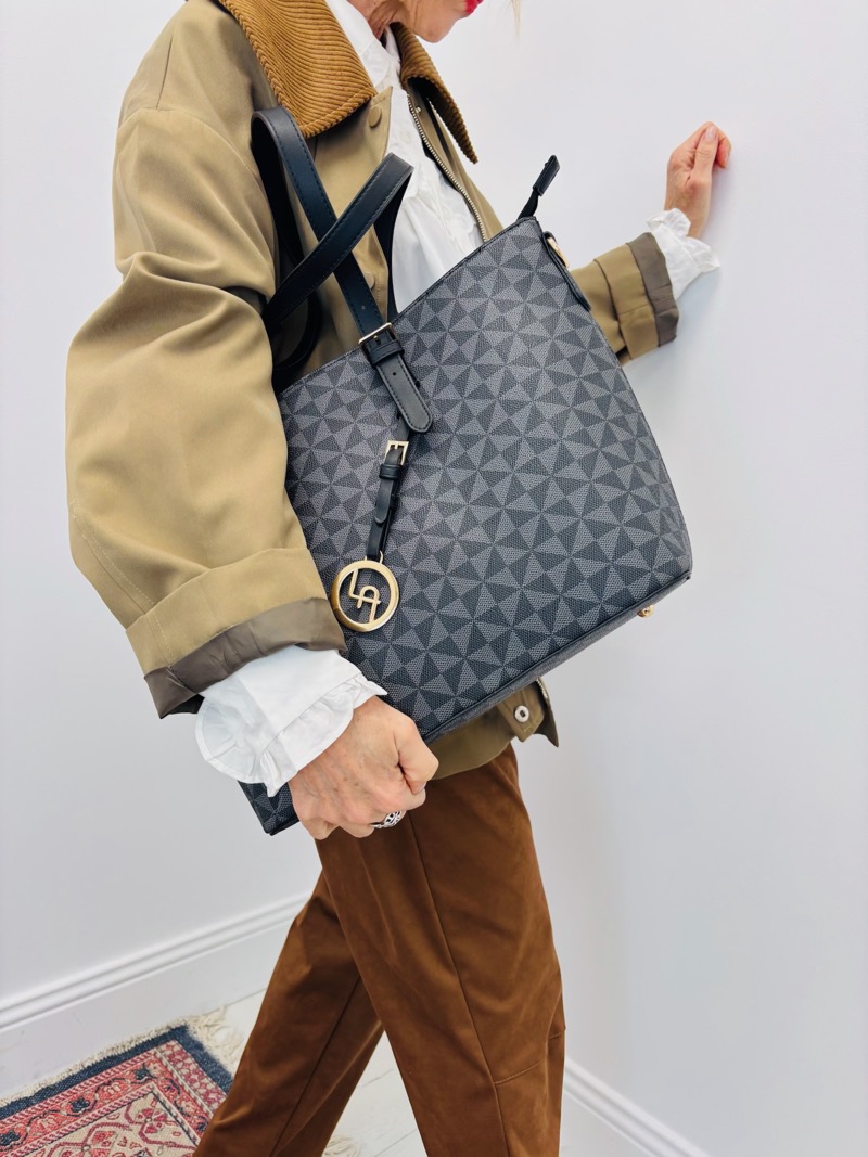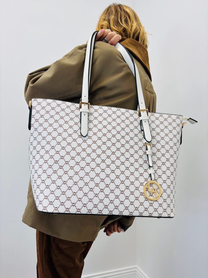 Son format cabas permet d’accueillir facilement tous les essentiels de la journée, tout en conservant une allure chic. Les anses confortables assurent un porté agréable à l’épaule ou à la main, tandis que le motif graphique apporte une touche mode discrète mais affirmée. Le bijou décoratif accroché à l’anse vient sublimer l’ensemble et renforce le caractère premium du modèle.