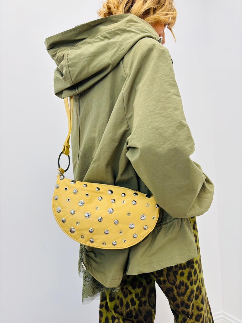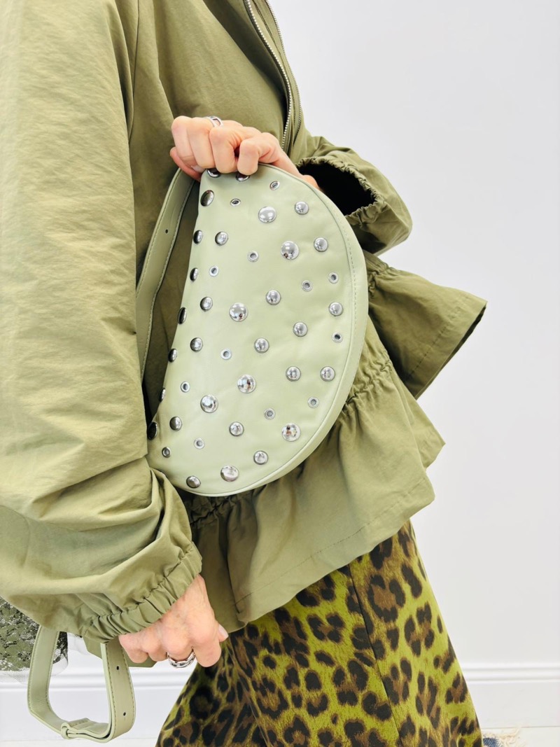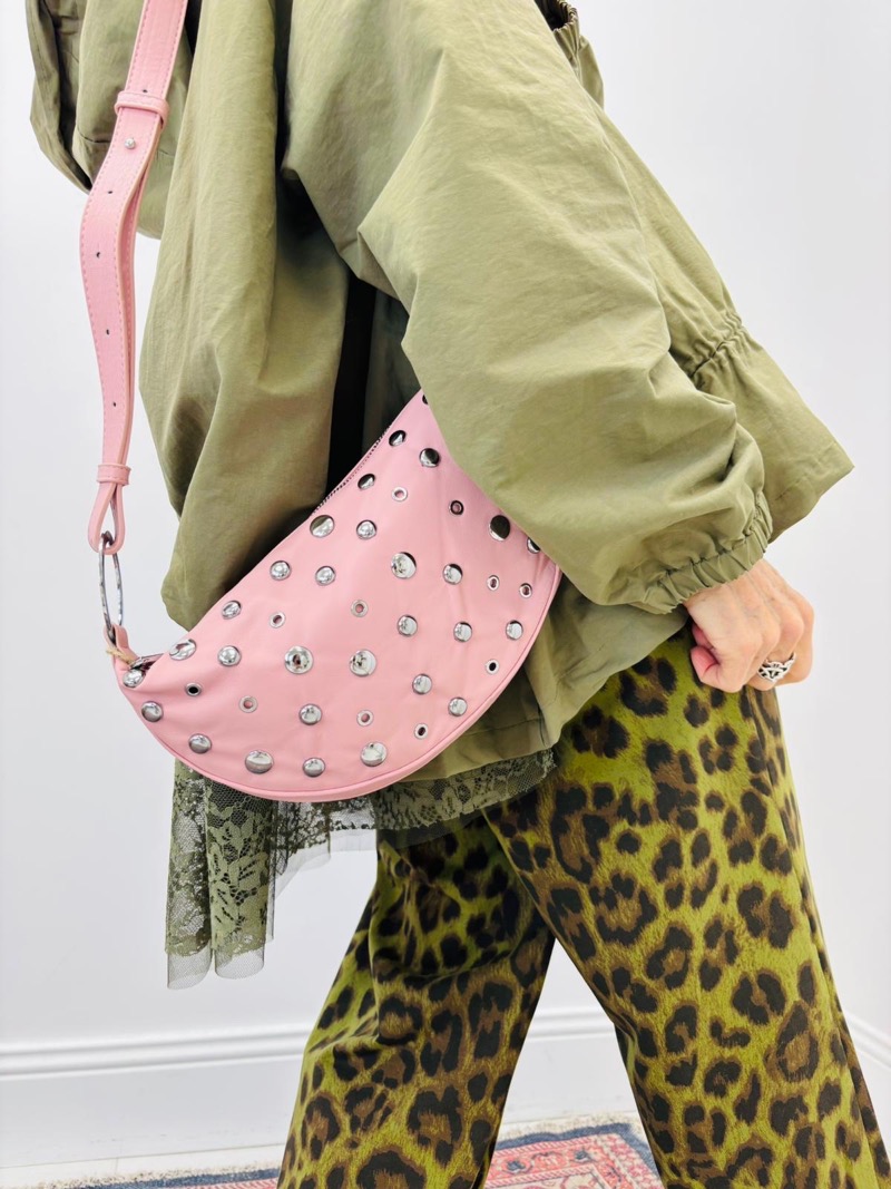 Ce sac banane revisite un grand classique avec une allure moderne et ultra tendance. Son format arrondi et ses détails cloutés métallisés apportent immédiatement du caractère à la silhouette, tout en restant facile à porter au quotidien.