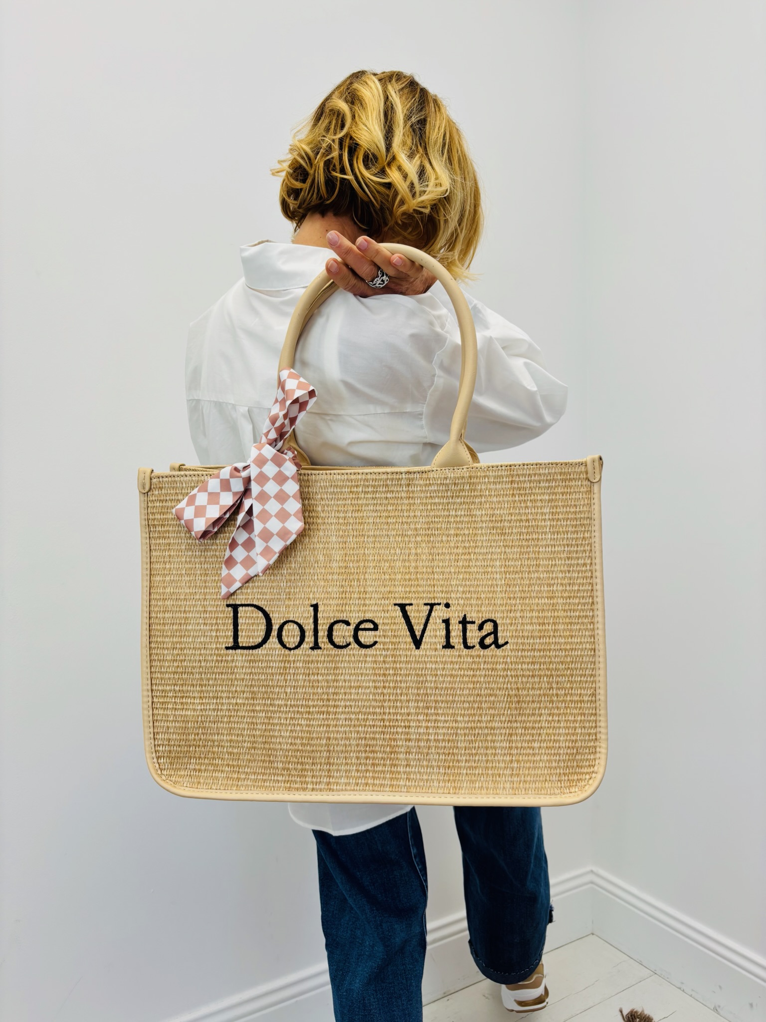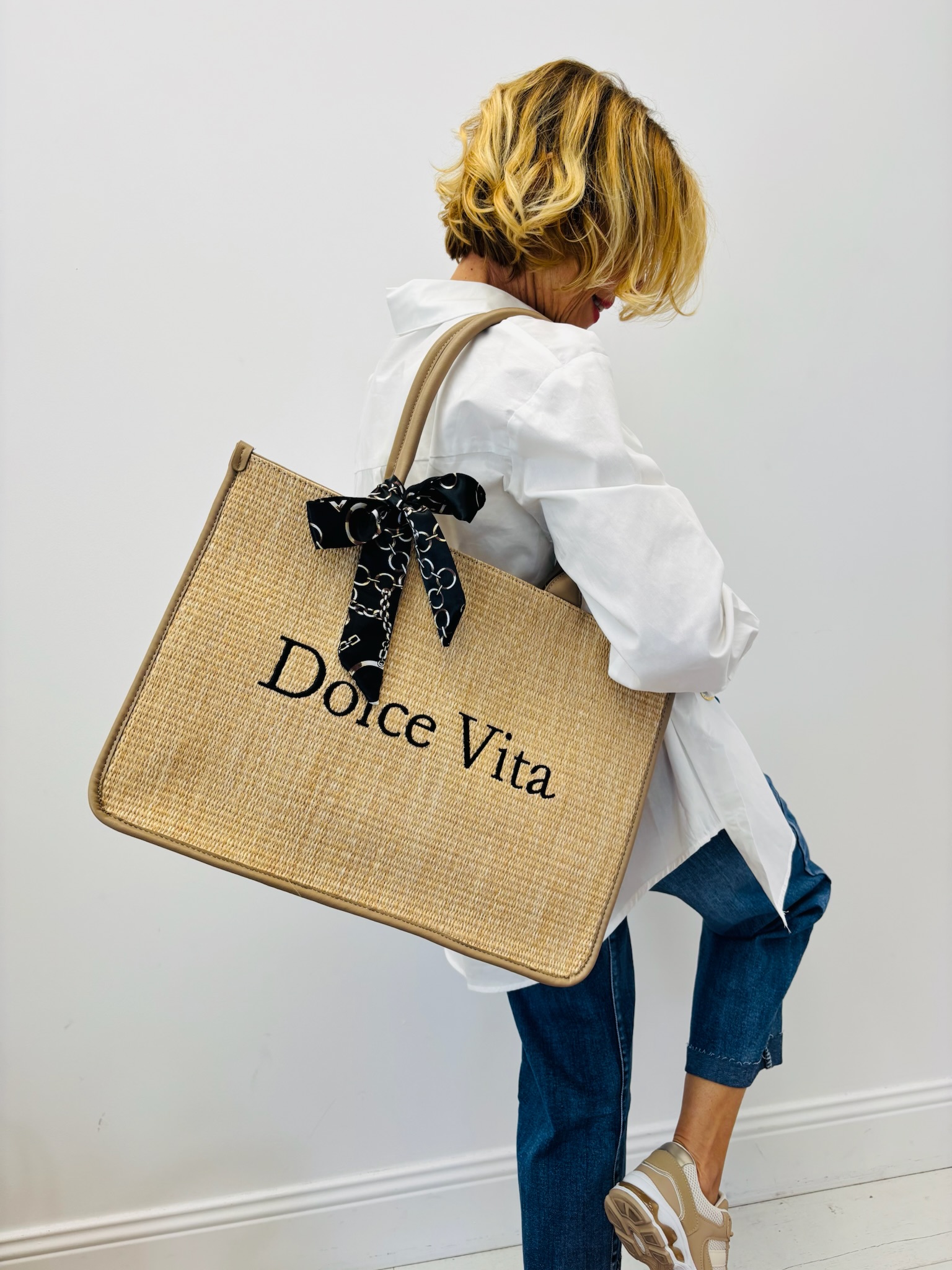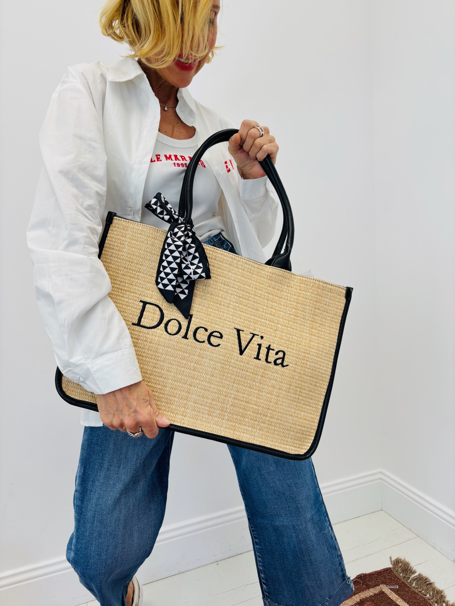 Le sac cabas “Dolce Vita” incarne parfaitement l’élégance estivale et l’esprit Riviera. Avec son effet paille structuré et son inscription noire contrastée, il apporte immédiatement une allure chic et solaire à la silhouette.