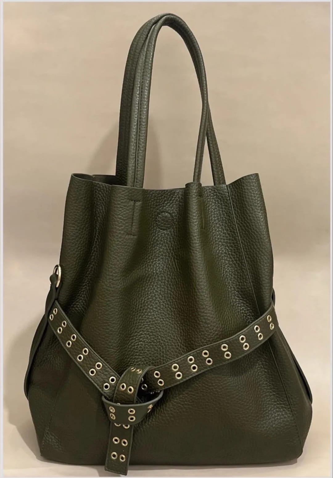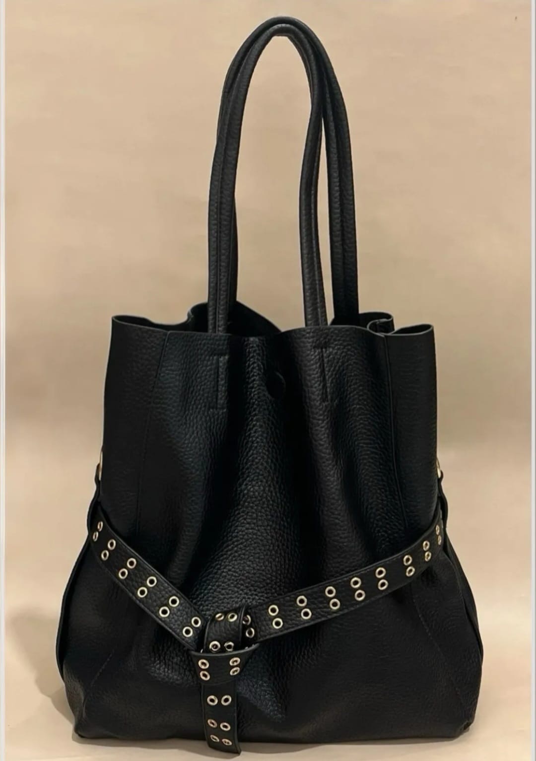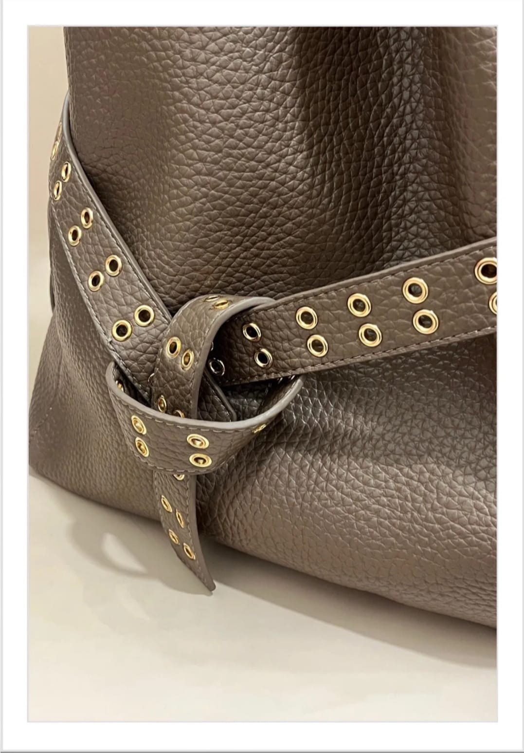 Un sac tendance et structuré au style urbain chic. Confectionné en simili cuir grainé de belle qualité, il séduit par sa forme souple et sa ceinture décorative à œillets qui apporte une touche rock et moderne. Idéal pour le quotidien, il allie style et praticité.