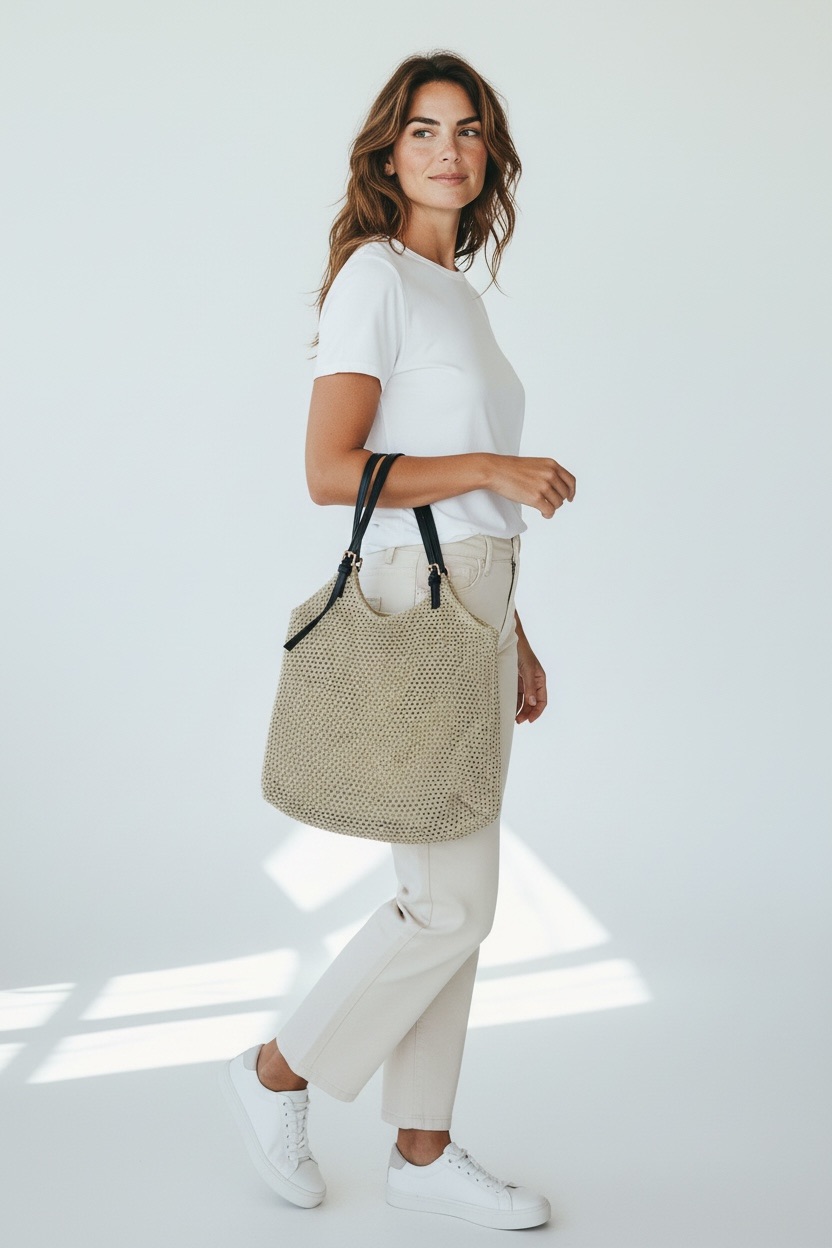 Ce sac crochet lurex se porte facilement avec une tenue aux tons naturels, un pantalon fluide, un jean ou une robe. Il apporte une touche lumineuse élégante à la silhouette tout en restant discret. Porté à l’épaule, il complète parfaitement un look bohème chic ou casual raffiné, aussi bien en journée qu’en soirée.