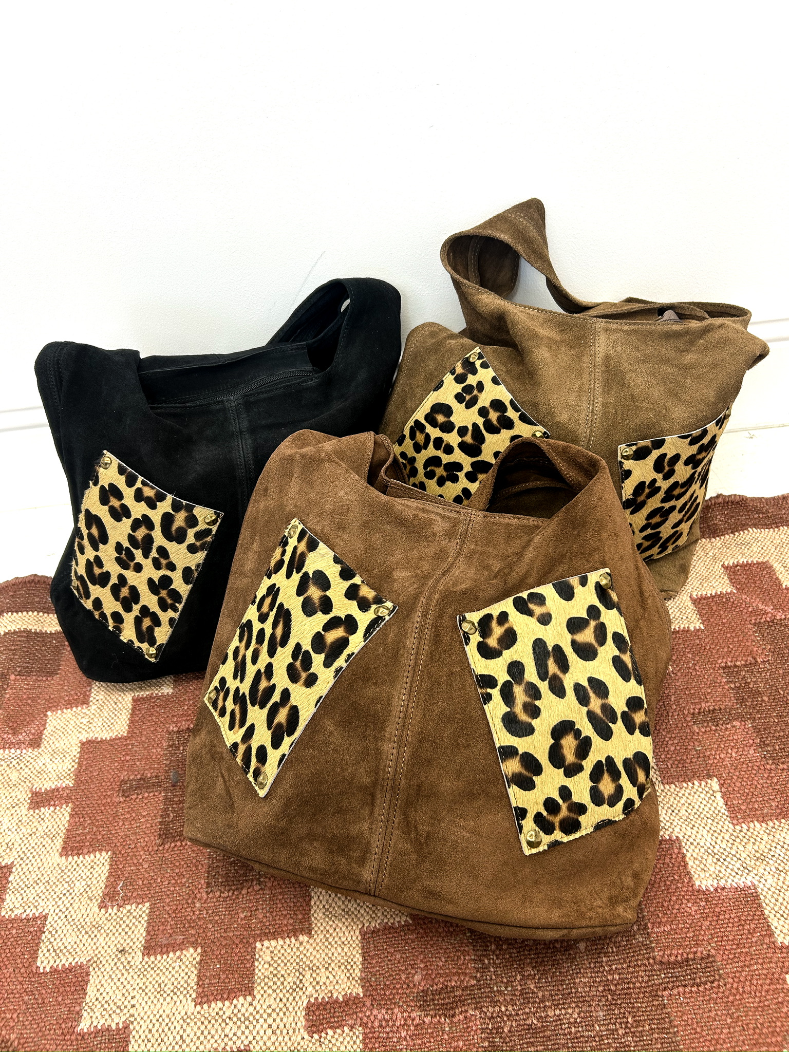 Ce sac en cuir véritable séduit par son allure bohème et ses poches avant en motif léopard, qui ajoutent une touche de caractère et de modernité.