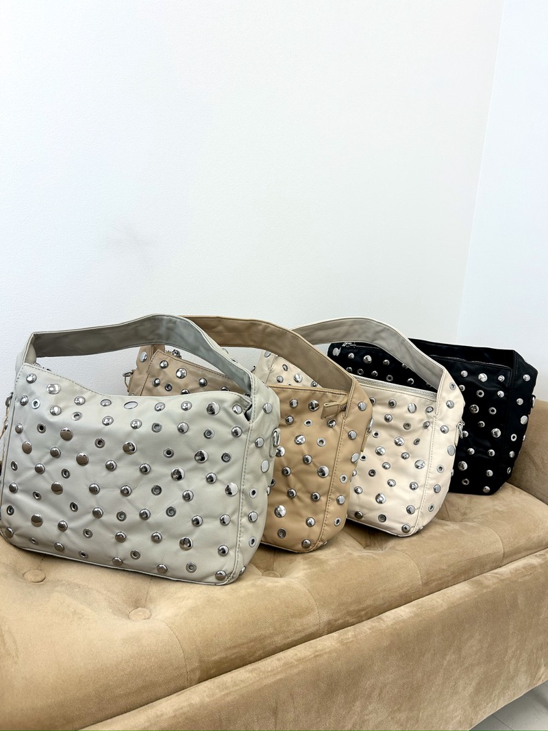 Le design est sublimé par des clous métalliques répartis harmonieusement sur l’ensemble du sac, apportant une touche rock chic parfaitement maîtrisée. Ce détail graphique donne immédiatement du relief et transforme le sac en véritable pièce mode, idéale pour dynamiser une tenue simple.
