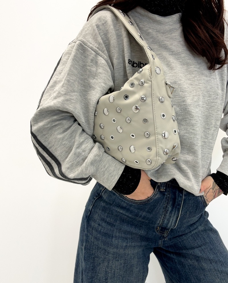 Porté à l’épaule avec un jean et un sweat ou une maille oversize, ce sac apporte une touche mode et contemporaine à la silhouette. Il se marie également très bien avec une tenue plus féminine pour créer un contraste stylé. Grâce à ses clous métalliques, il devient la pièce forte du look, idéale pour affirmer un style moderne et tendance sans effort.