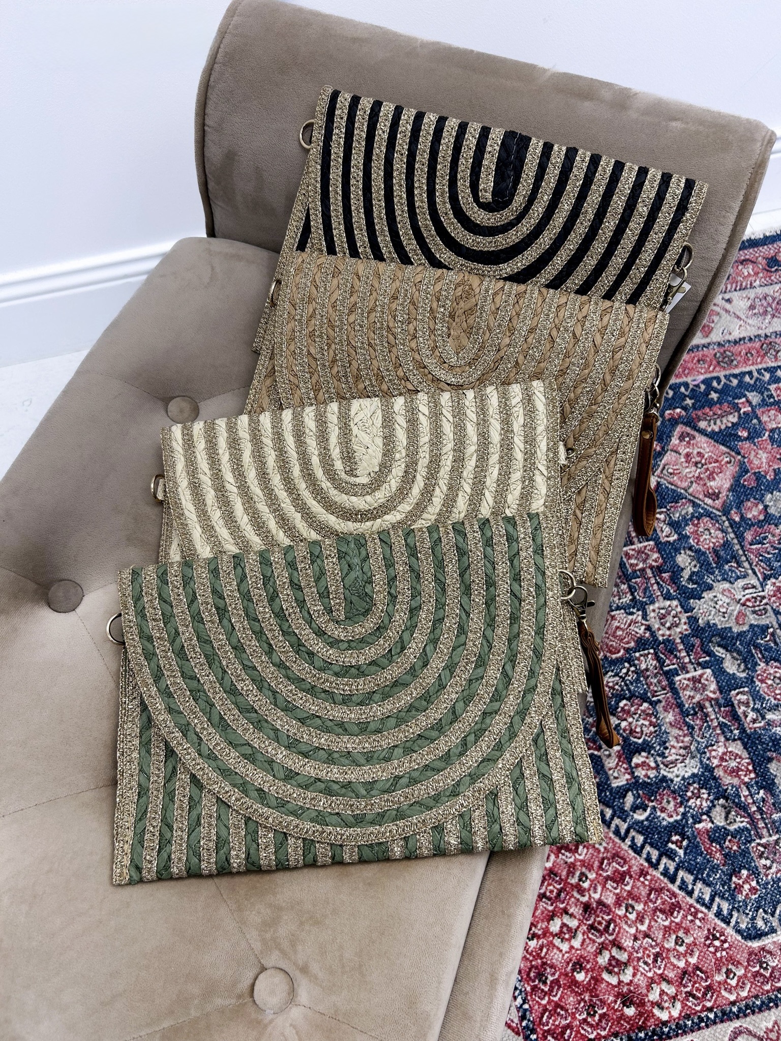Cette pochette tressée séduit par son design graphique et son esprit bohème chic subtilement rehaussé de touches métallisées. Inspirée de l’artisanat revisité, elle associe un tressage structuré à un motif en arcs concentriques qui apporte du relief et une signature visuelle élégante.