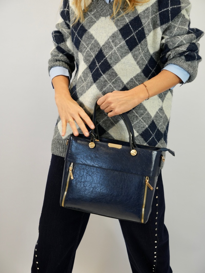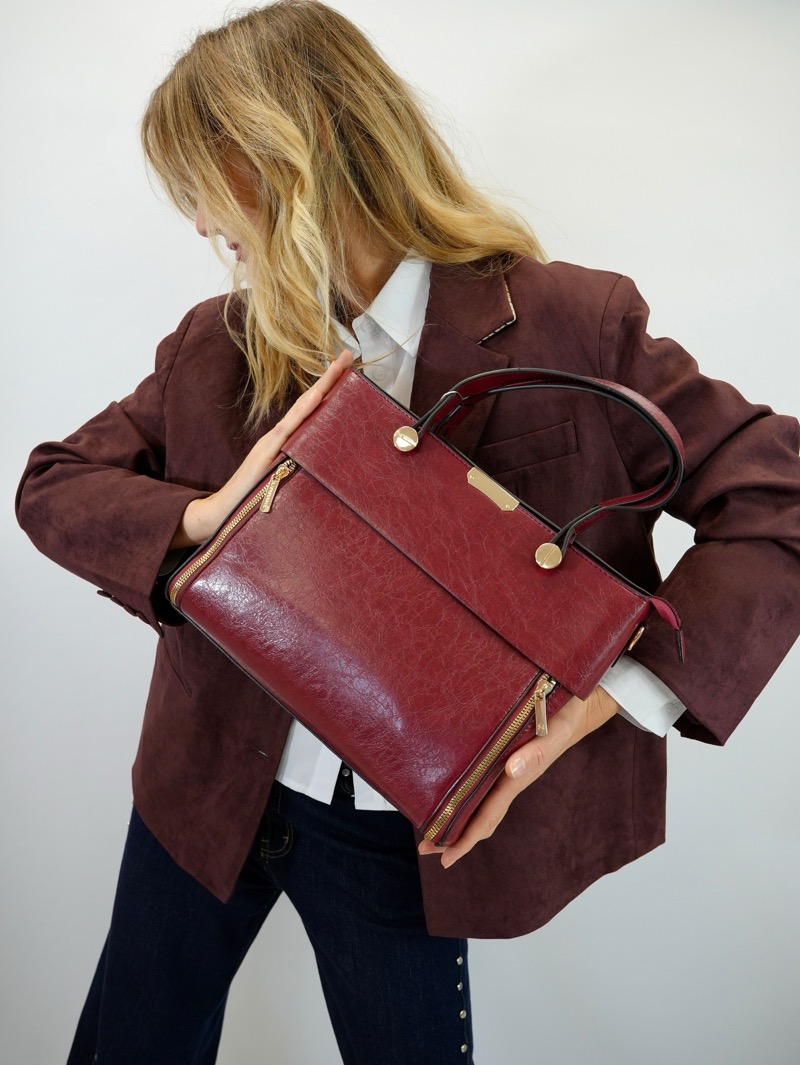 Ce sac structuré séduit par son design élégant et ses lignes épurées. Sa matière rigide assure une belle tenue tout au long de la journée. Il est agrémenté de deux fermetures zippées verticales sur les côtés, d’une fermeture principale à zip et de poignées arrondies confortables. Les finitions métalliques dorées apportent une touche de sophistication. Pratique et spacieux, il s’adapte aussi bien à une tenue habillée qu’à un look professionnel. Porté main ou épaule grâce à sa bandoulière amovible.