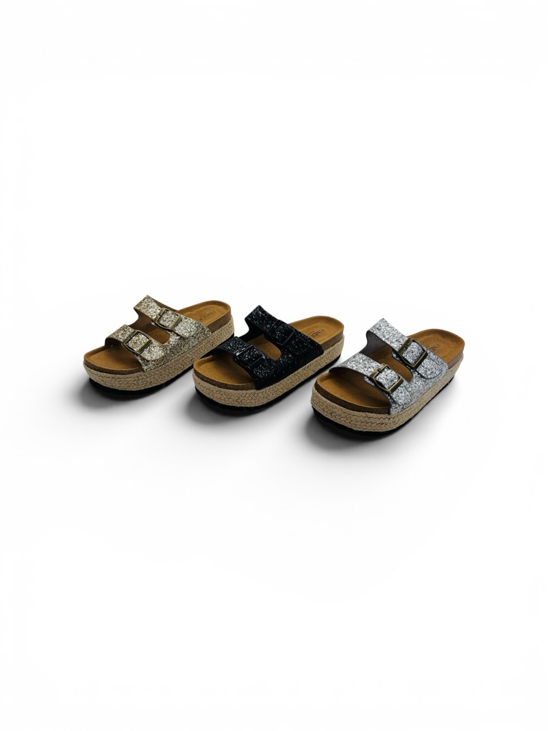 Apportez une touche lumineuse et tendance à votre collection avec ces sandales plateformes au design à la fois moderne et intemporel. Conçues pour allier confort et style, elles séduisent immédiatement par leurs brides scintillantes ornées de paillettes et leurs boucles métalliques ajustables qui rappellent l’esthétique iconique des sandales bohèmes revisitées.