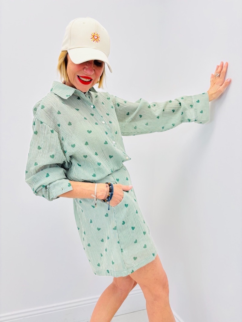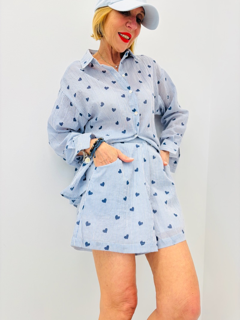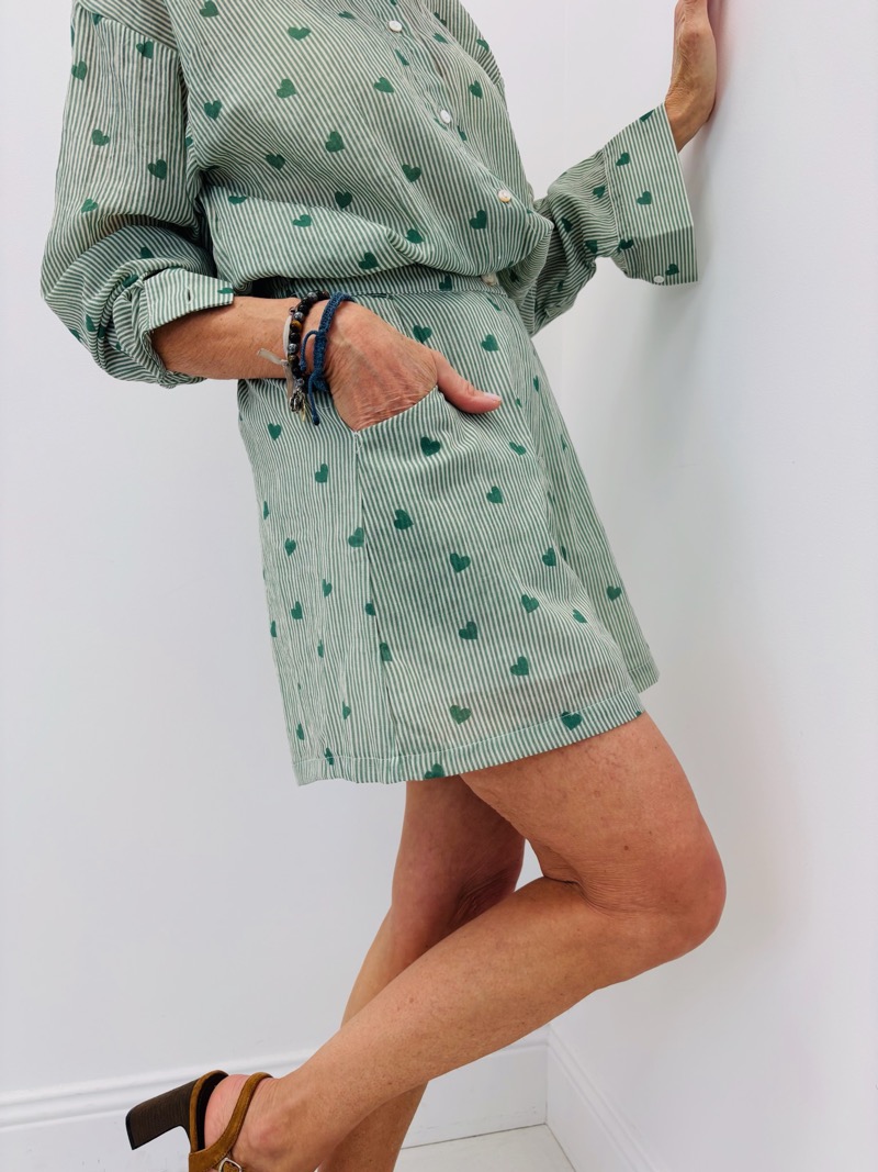 Ce short rayé à motifs cœurs est la pièce idéale pour compléter un look estival tendance et facile à porter. Avec ses fines rayures et ses petits cœurs imprimés, il apporte une touche fraîche, moderne et très commerciale.