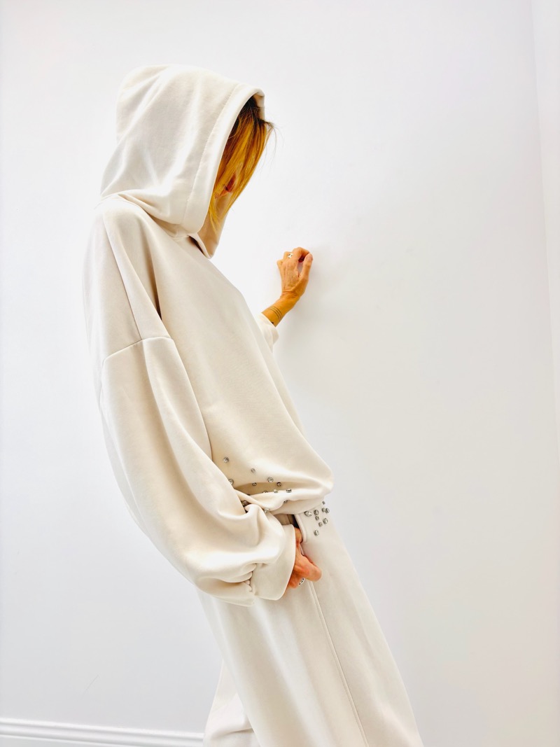 Découvrez le sweat à capuche perlé 100% coton, une pièce coup de cœur Made in Italy qui allie confort absolu, esprit casual chic et détails raffinés. Sa coupe oversize ultra confortable et son intérieur doux en coton épais en font un indispensable pour les clientes recherchant un vêtement cosy mais tendance. Les perles délicatement appliquées sur le bas du sweat apportent une touche féminine et lumineuse, transformant un classique du dressing en véritable pièce mode.