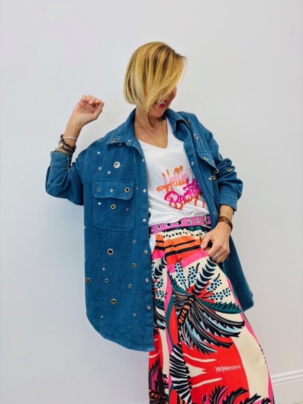 Il peut également se combiner avec une jupe en simili cuir ou un pantalon tailleur pour casser les codes et apporter une touche mode à une tenue plus structurée. Les détails bijoux donnent immédiatement du caractère à la silhouette.