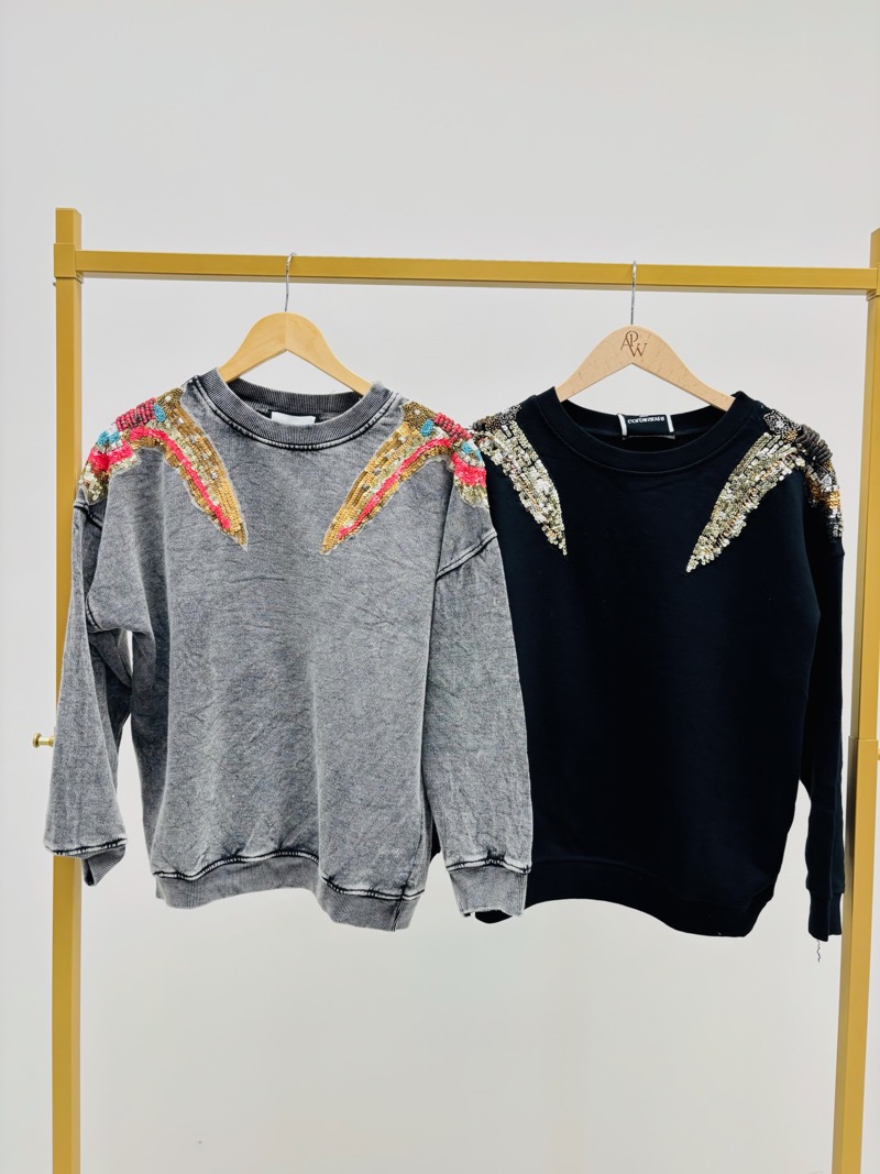 Son véritable atout réside dans le travail des épaules : une application généreuse de sequins et perles formant un motif structuré effet ailes graphiques. Ce détail lumineux transforme un sweat classique en pièce mode, apportant un contraste élégant entre l’esprit sportswear et la brillance sophistiquée des ornements.