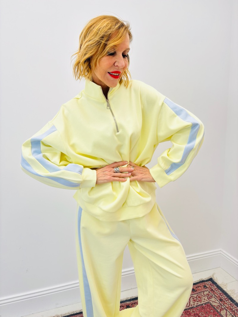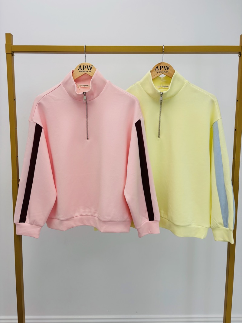 Le détail phare réside dans ses bandes contrastées le long des manches, qui apportent une touche dynamique et mode, tout en allongeant visuellement la silhouette. Le zip frontal au col permet d’ajuster l’ouverture selon le style souhaité : fermé pour un look plus structuré, ou légèrement ouvert pour une allure plus casual.