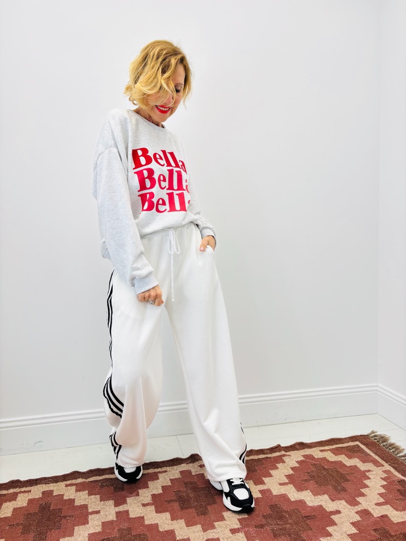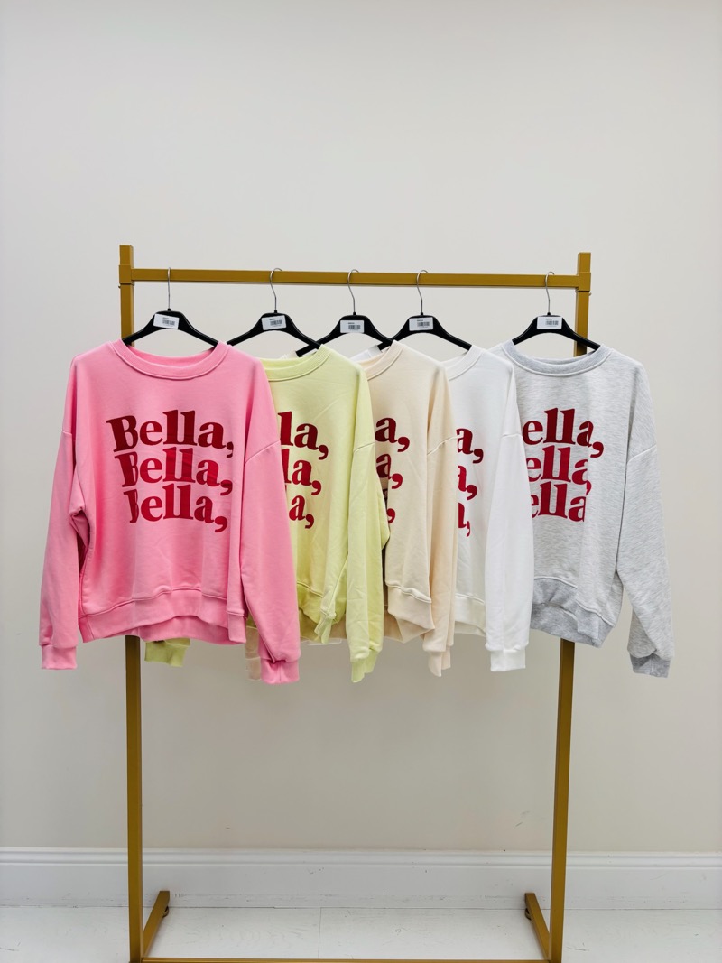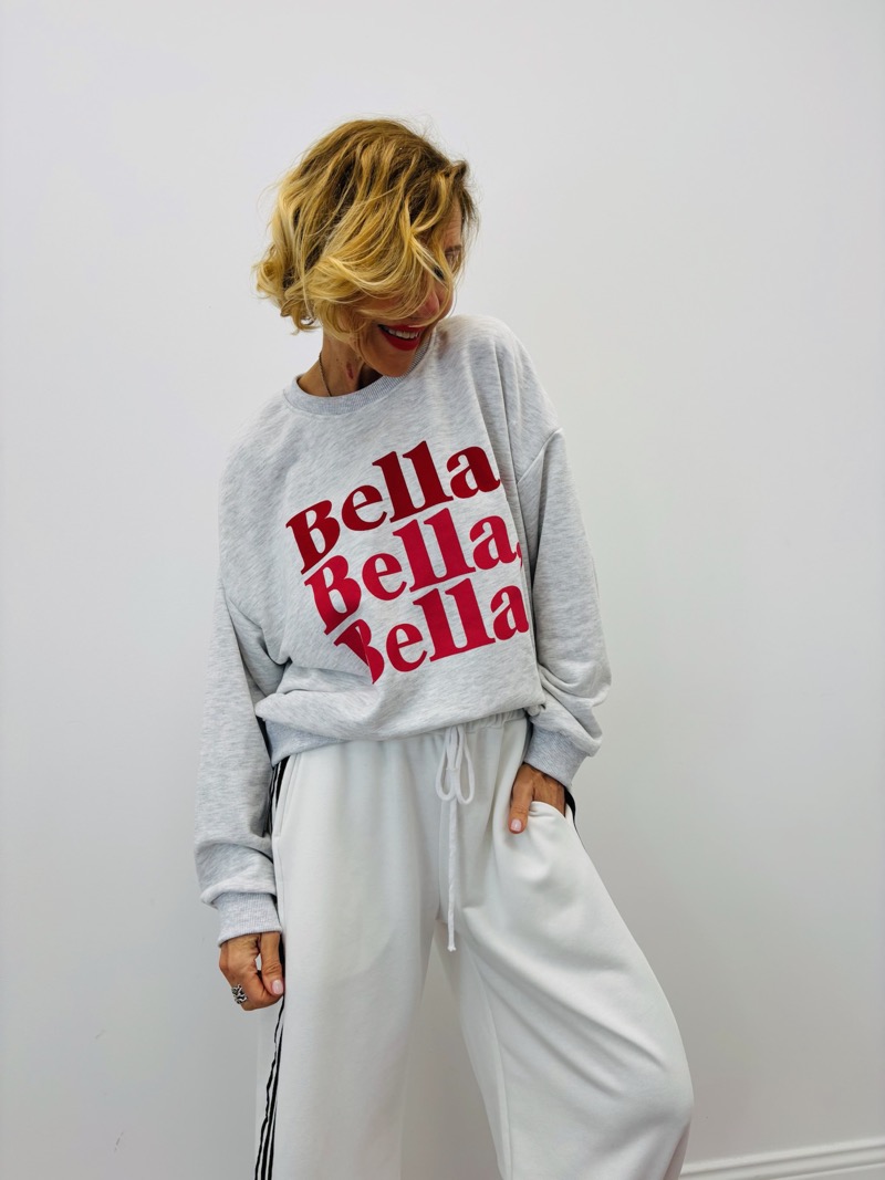 À la fois fun et ultra tendance, ce sweat imprimé “Bella, Bella, Bella” s’impose comme la pièce coup de cœur de la saison. Son message graphique fort, décliné en lettres rouges impactantes, apporte immédiatement caractère et modernité à la silhouette.