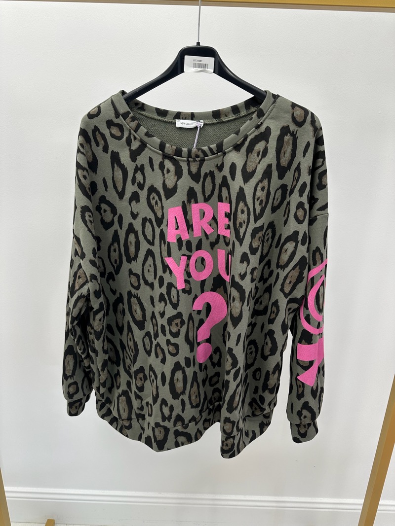 Sweat imprimé léopard kaki à message fluo “ARE YOU ?” – Coupe oversize tendance