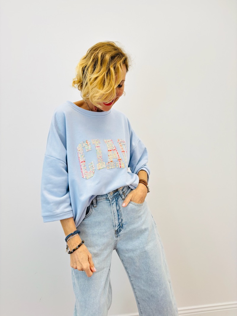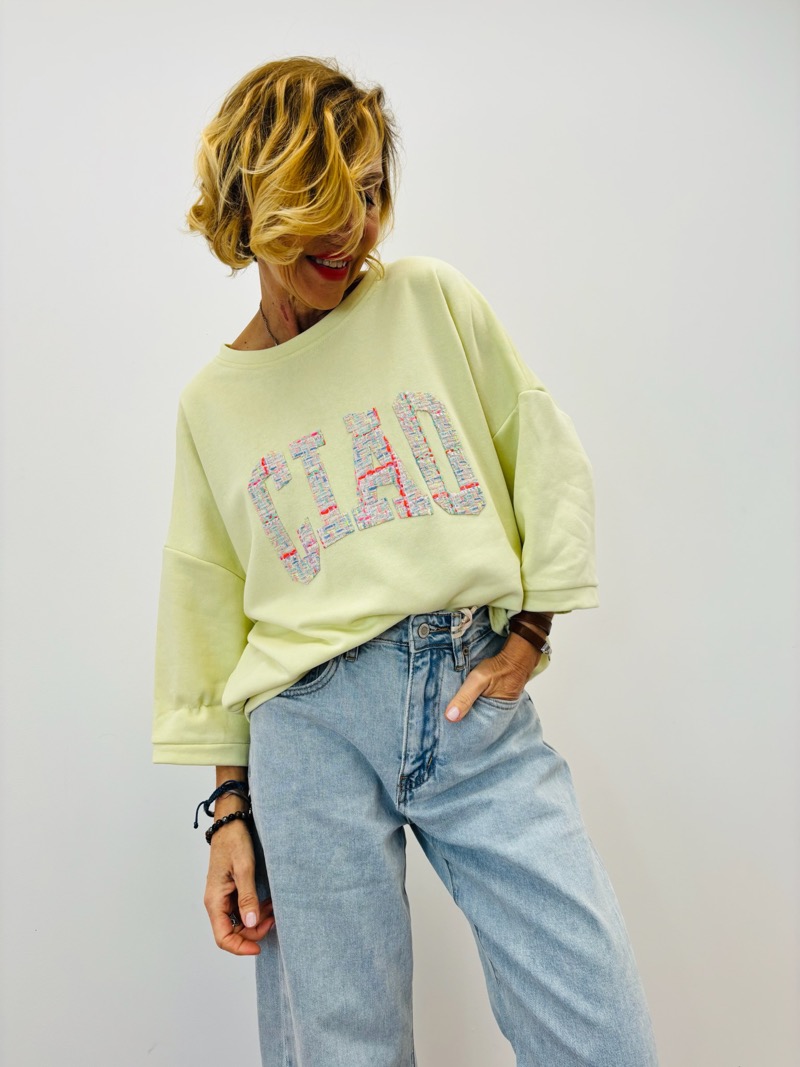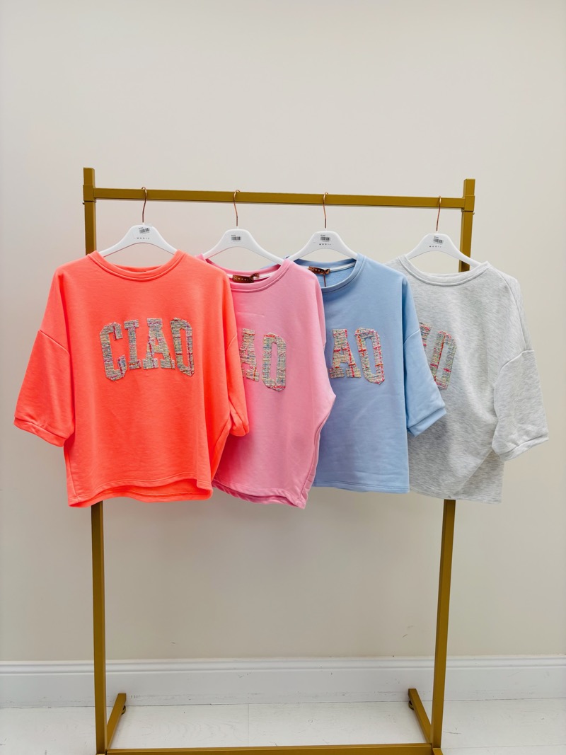 Inspiré de l’élégance italienne décontractée, ce sweat manches 3/4 “Ciao” apporte une touche fraîche et lumineuse à une capsule casual chic. Son inscription texturée effet tweed multicolore crée un contraste subtil et raffiné sur des bases pastel modernes.