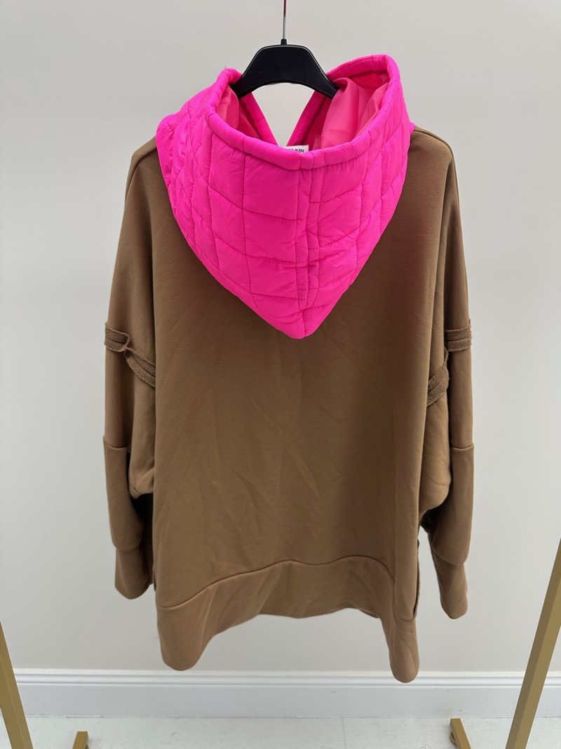 Sweat oversize camel à capuche matelassée rose fluo – Style urbain chic grande taille