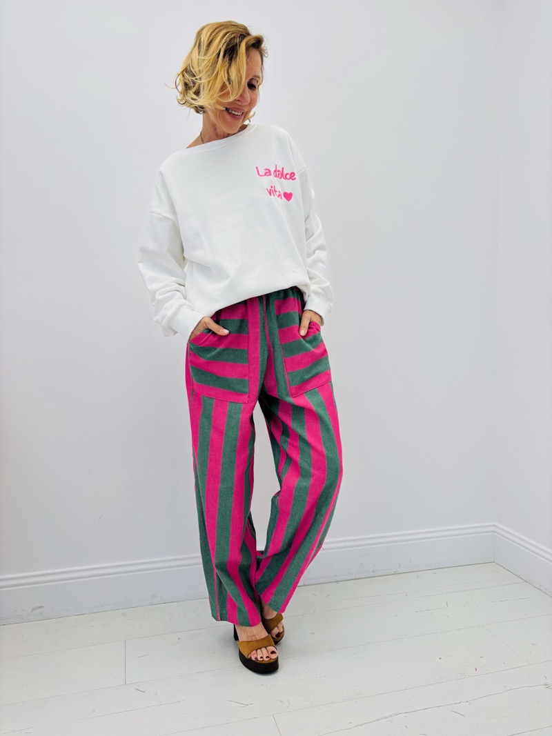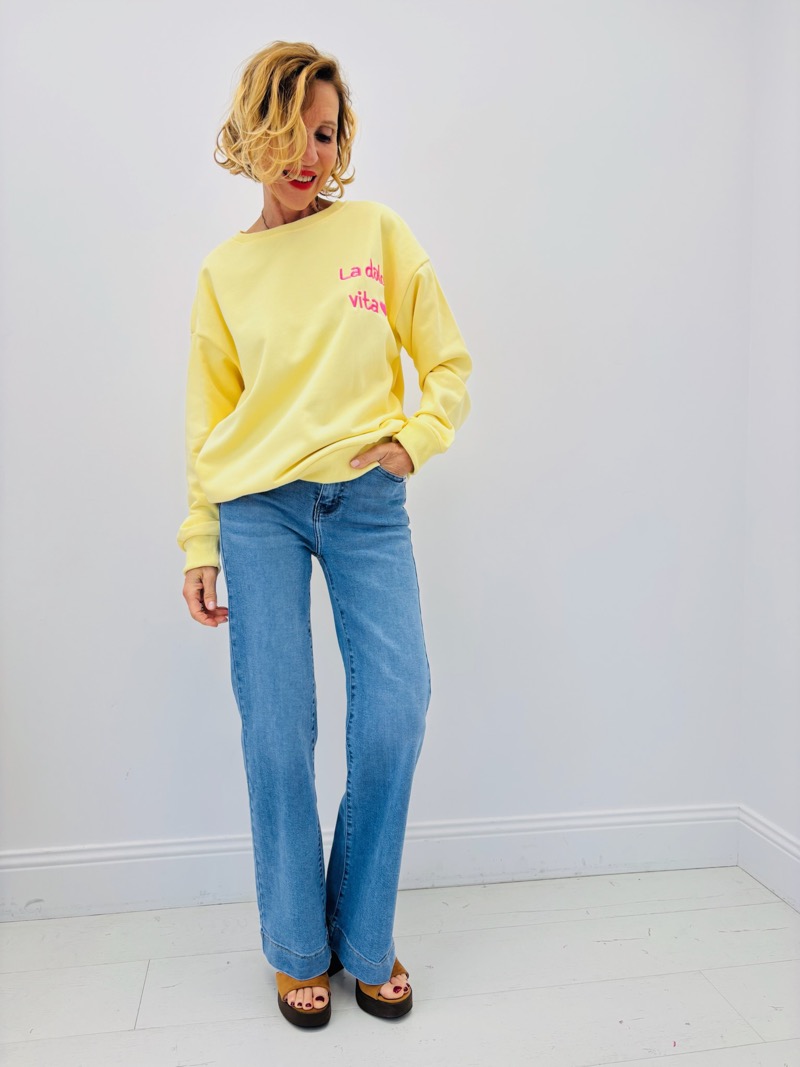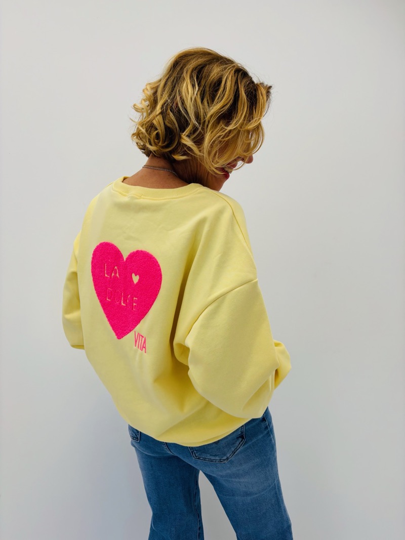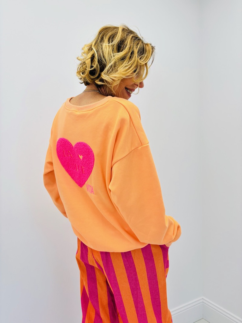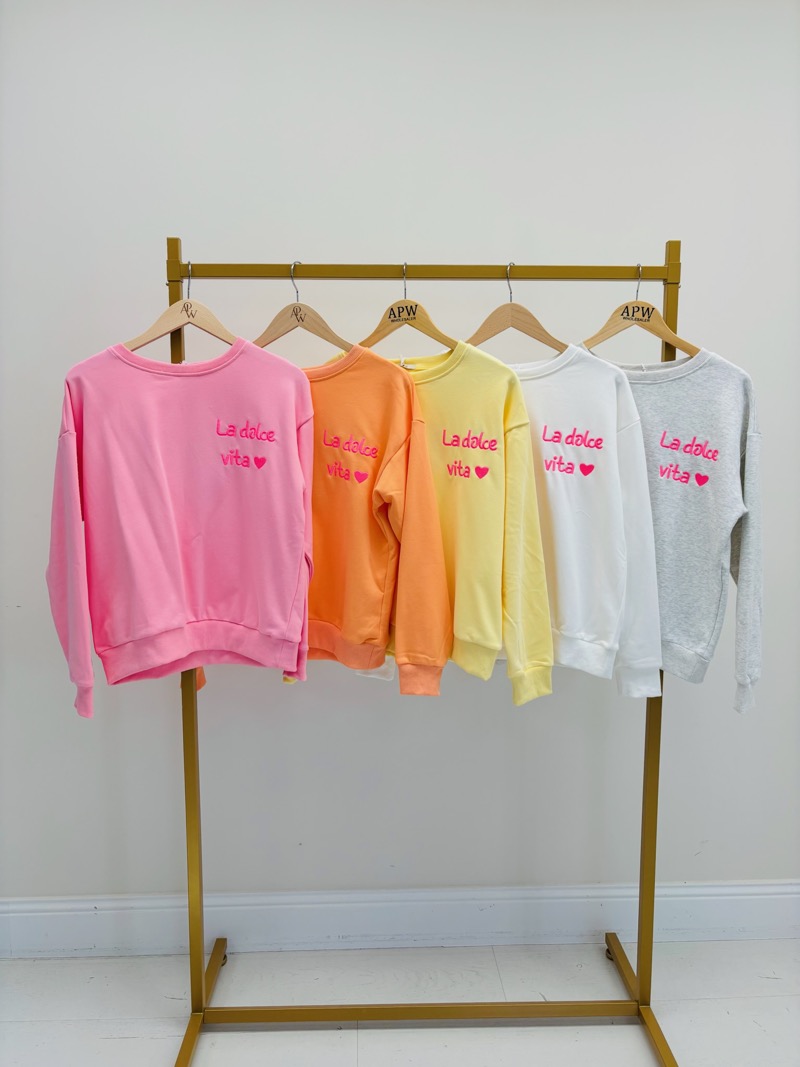 Ce sweat revisite le basique du vestiaire avec une touche graphique et colorée inspirée de l’esprit italien. Son inscription « La Dolce Vita » associée à un cœur apporte une signature moderne et joyeuse qui évoque la douceur de vivre et les inspirations estivales.