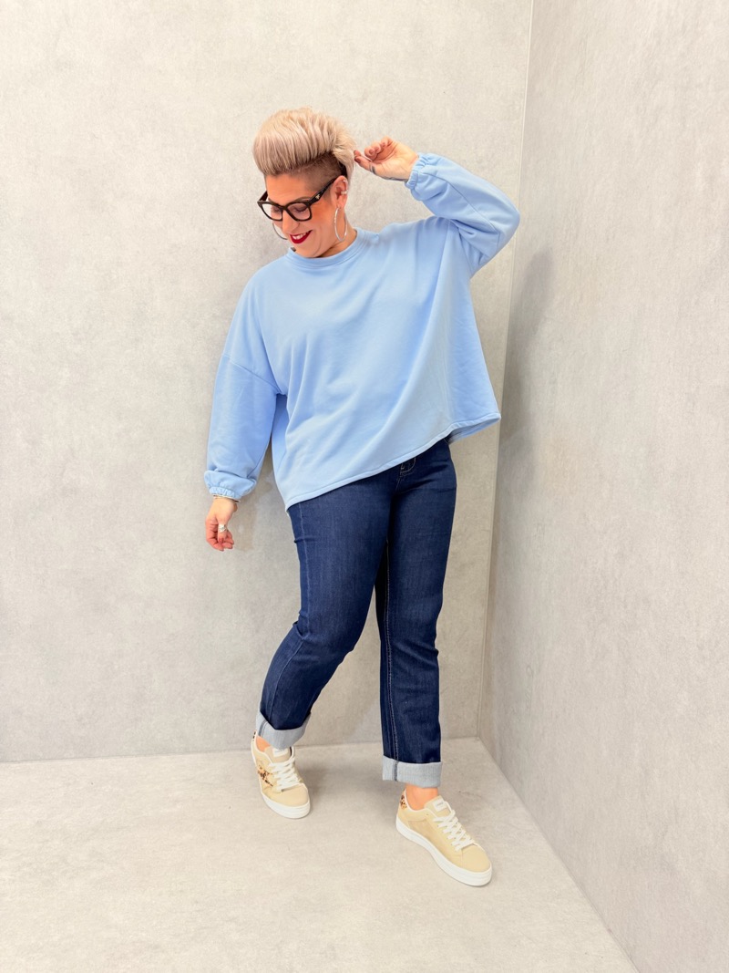 Sa coupe oversize a été spécialement pensée pour la morphologie grande taille : elle offre une aisance parfaite, sans marquer les formes, tout en apportant un tombé fluide et structuré. Les épaules légèrement tombantes et les manches longues renforcent l’allure décontractée du modèle, tout en restant élégantes. Le bas du sweat et les poignets sont délicatement resserrés pour un maintien confortable et une silhouette harmonieuse.