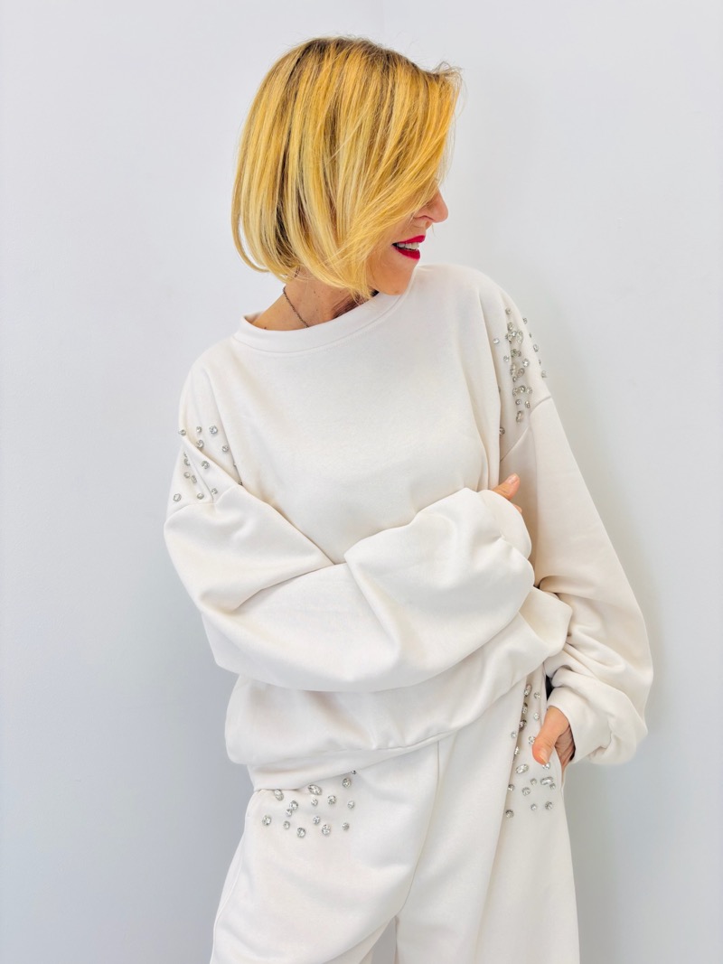 Son design oversize, très tendance cette saison, assure un tombé fluide et flatteur pour toutes les morphologies. La particularité de ce modèle réside dans ses détails en strass délicatement appliqués sur les épaules, apportant une touche lumineuse et sophistiquée qui élève instantanément le look. C’est un sweat casual, mais avec un vrai twist mode : simple, confortable, et pourtant résolument chic.